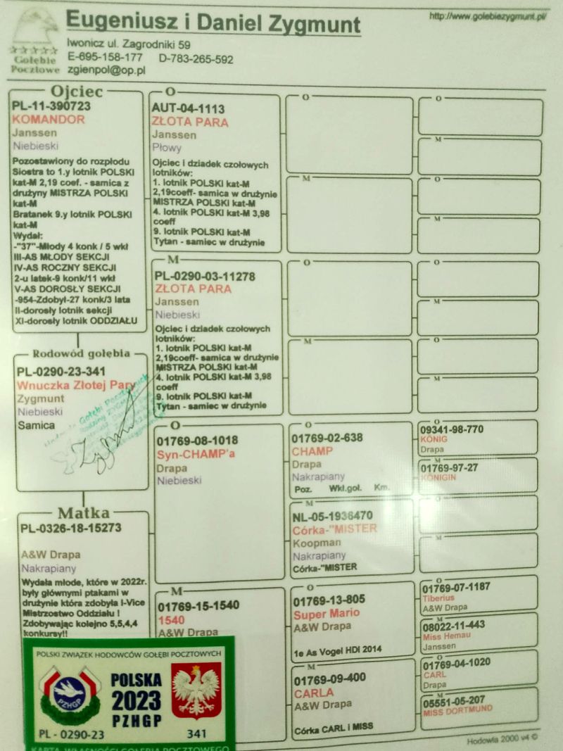 Opis: Oryginalny gołąb z hodowli Eugeniusz i Daniel Zygmunt. UWAGA oferowany gołąb to samiec. Szczegóły pochodzenia w rodowodzie. Więcej informacji pod nr tel.: 539 388 801 *możliwość wysyłki lub odbioru gołębia na wystawie w Katowicach (sobota)