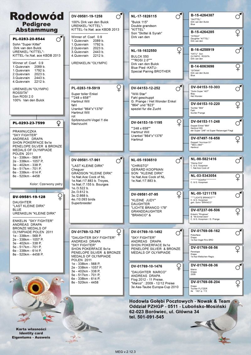 Oryginalny gołąb z hodowli Nowak & Team, szczegóły pochodzenia, rodowód poniżej. Transport gołębi prywatnym transportem.
