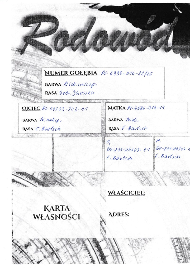 PL-014-22(25)-6993 Unikat - Wnuk oryginalnych gołębi z hodowli Braci Janssen