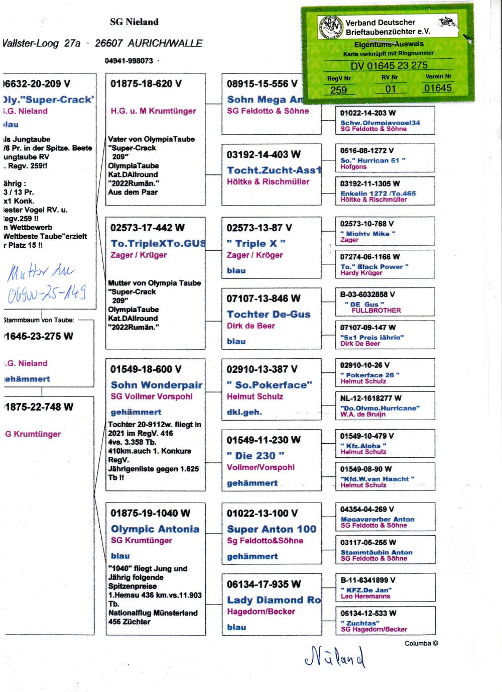 Opis: OLR German Classic 2025 Szczegóły pochodzenia w rodowodzie. Gołąb brał udział w rywalizacji na wspólnym gołębniku OLR German Classic (wyniki dostępne na stronie internetowej - www.german-classic-olr.de). Gołąb jest sprzedawany bezpośrednio od organizatora i znajduje się w Polsce, można go obejrzeć w miejscowości Zblewo (woj. pomorskie), po wcześniejszym kontakcie telefonicznym. Więcej informacji o gołębiu i transporcie pod nr tel.: 511 607 710.