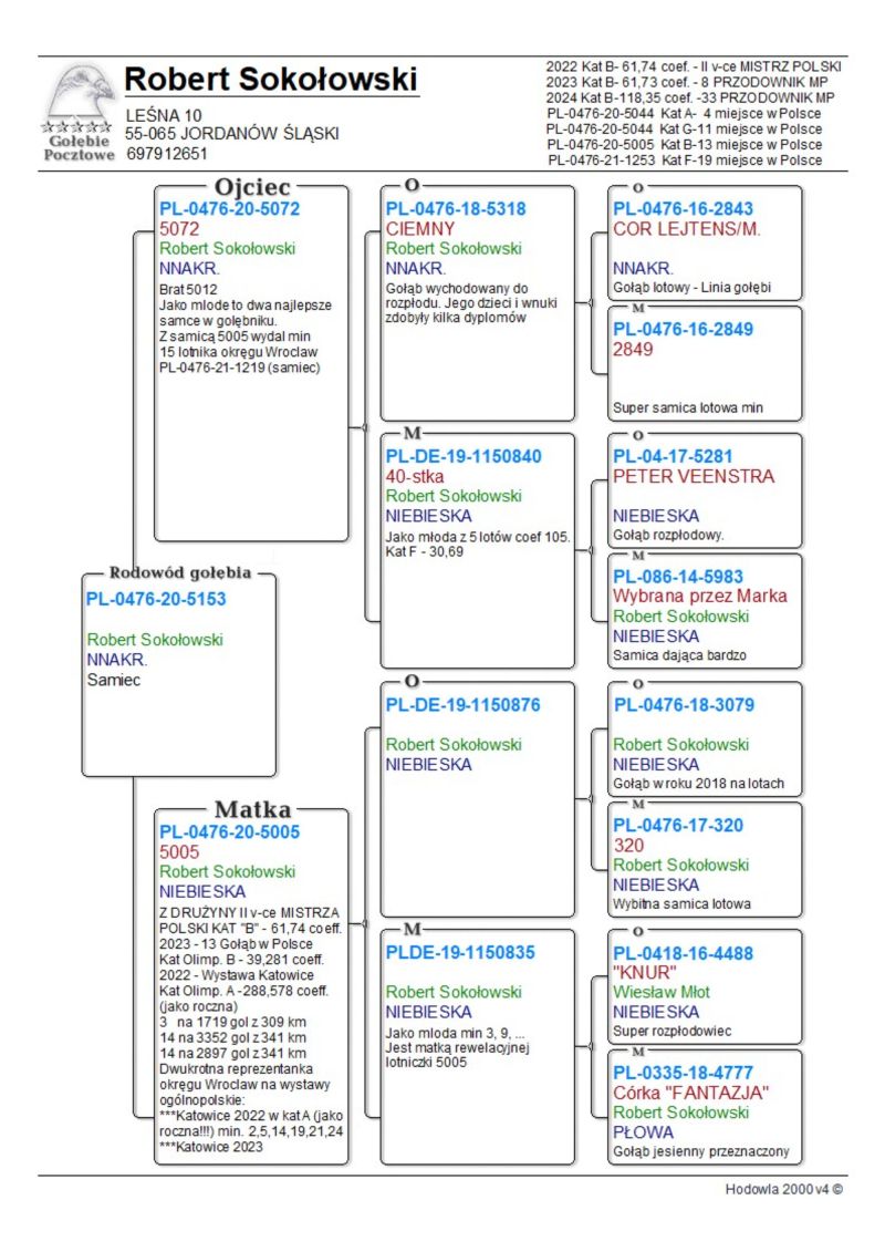 Opis: Piękny samiec wywodzący sią z sprawdzonych gołębi rozpłodowych. Jej rodzeństwo osiąga wspaniałe wyniki lotowe. Poniżej kilka osiągnieć z ostatnich lat: ROBERT SOKOŁOWSKI II WICEMISTRZ POLSKI 2022 kat B 2023 Okręg kat IM - 4 przodownik kat A - 1 przodownik kat B - MISTRZ kat C - 4 przodownik kat M - 40 przodownik kat D - 3 Przodownik kat Roczne - 2 przodownik Region kat B - II V-ce Mistrz kat D - II V-ce Misrrz Intermistrzostwo - 20 przodownik kat. A - 8 przodownik kat C - 30 przodownik 2022 II WICEMISTRZ POLSKI 2022 kat B - Kategoria A - 162,93 coeff. - Intermistrzostwo 2022 - 7 Przodownik - 337,981 coeff. Ogólnopolska Wystawę Gołębi Pocztowych Katowice 2023. - Samica PL-0476-20-5044 - Kat. A - 39,68 coeff. - Samiec PL-0476-22-5971 - Kat. F - 14,68 coeff. 2021 Mistrzostwo Polski 2021 *** GMP - 47 Przodownik *** Kat A - 66 Przodownik *** DERBY - 28 Przodownik *** Mlode - 56 Przodownik **** 4 golębie byly na wystawie ogólnopolskiej w Katowicach w tym ****11 goląb w Polsce w G- 16,182 *** 14 goląb w Polsce w F- 3,705 coeff***.