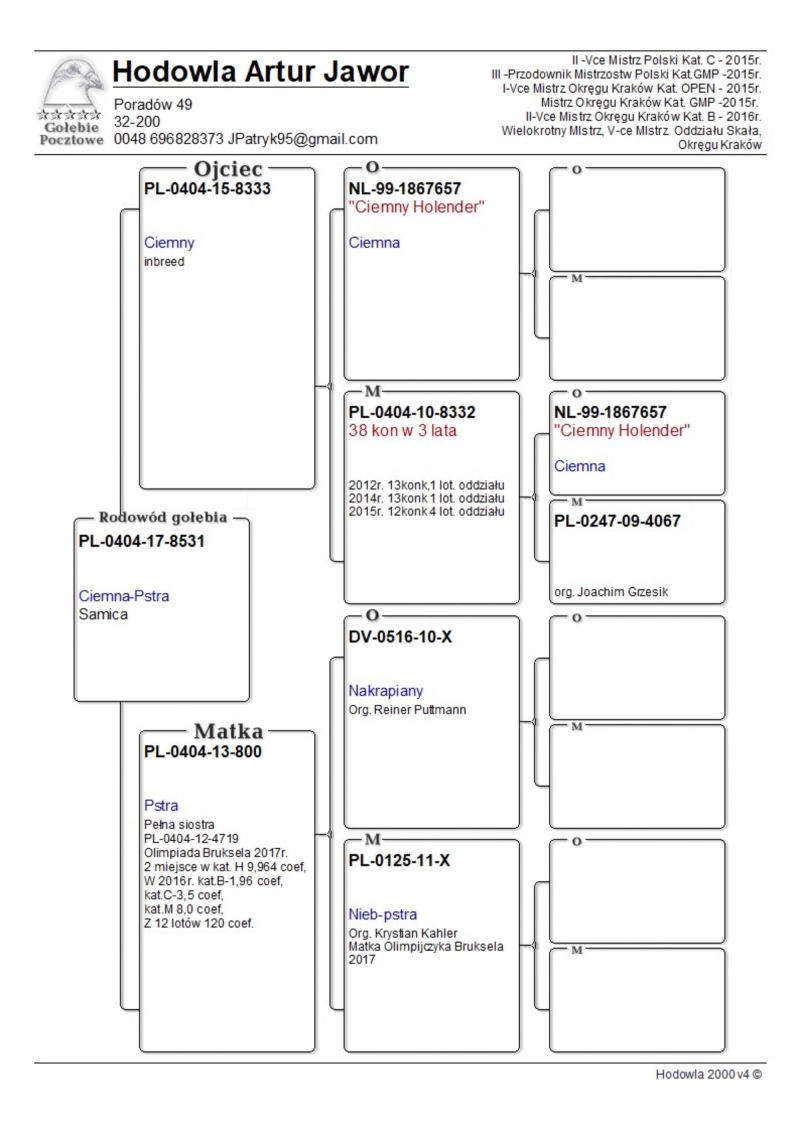 Na aukcjach oferuję wszystkie młode przelotowane cały program. Gołębie wylatały w tym roku we wszystkich współzawodnictwach I Vce Mistrza Oddziału (po rocznej przerwie). W 100 lotnikach w Oddziele ok. 40szt. Młode nie zaciemniane, wiosenne. We wcześniejszych latach rodzeństwo lub rodzice wylatały wiele czołowych lokat w tym tytuły Mistrzowskie kat. A, GMP czy OPEN. Gołębie wywodzą się z topowych hodowli (niejednokrotnie bezpośrednio po najlepszych ptakach). Więcej informacji w rodowodach lub pod telefonem 509898632. Płeć gołębia określona orientacyjnie – nie daję 100% pewności. Odbiór osobisty lub po zorganizowaniu transportu (cena do ustalenia).