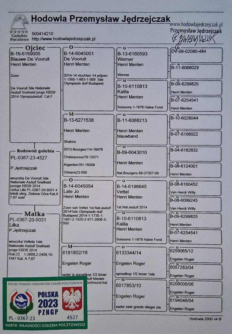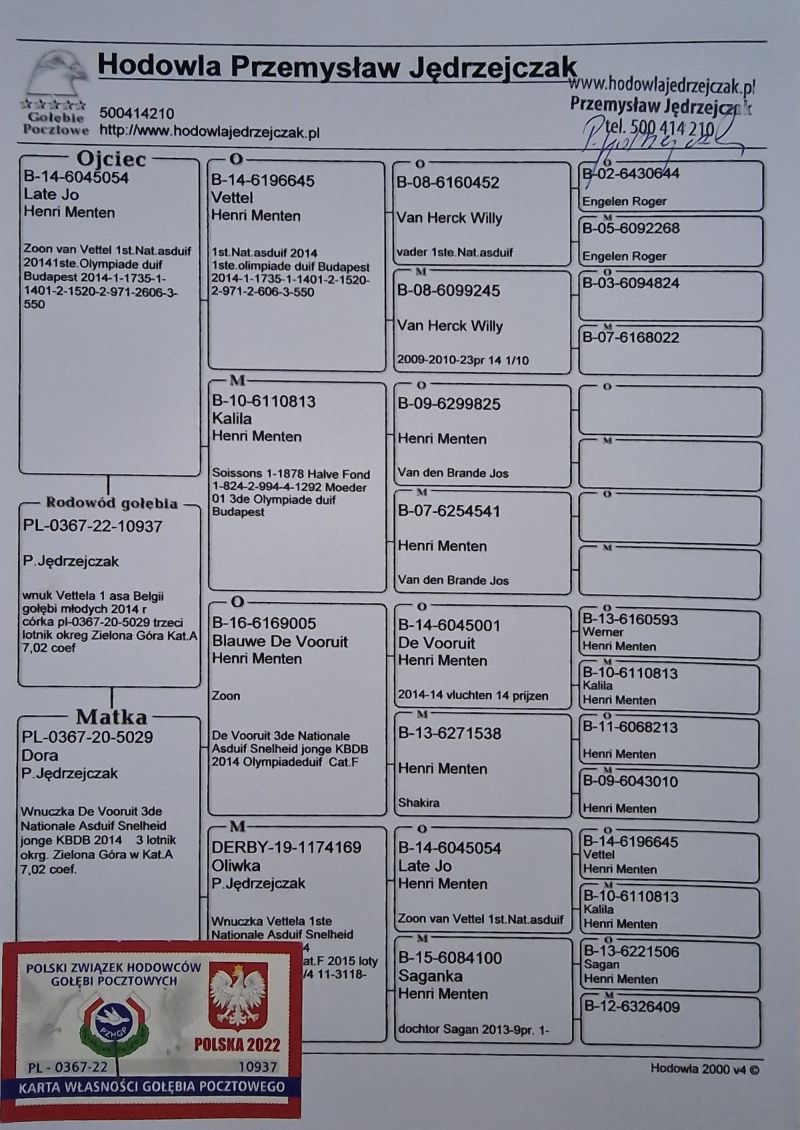 Kontakt: 509898632Opis: Na aukcjach oferuję wszystkie młode przelotowane cały program. Gołębie wylatały w tym roku we wszystkich współzawodnictwach I Vce Mistrza Oddziału (po rocznej przerwie). W 100 lotnikach w Oddziele ok. 40szt. Młode nie zaciemniane, wiosenne. We wcześniejszych latach rodzeństwo lub rodzice wylatały wiele czołowych lokat w tym tytuły Mistrzowskie kat. A, GMP czy OPEN. Gołębie wywodzą się z topowych hodowli (niejednokrotnie bezpośrednio po najlepszych ptakach). Więcej informacji w rodowodach lub pod telefonem 509898632. Płeć gołębia określona orientacyjnie – nie daję 100% pewności. Odbiór osobisty lub po zorganizowaniu transportu (cena do ustalenia).