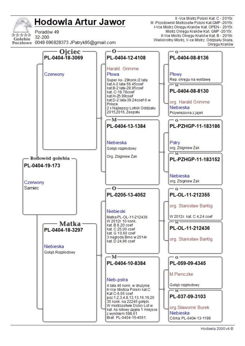 Kontakt: 509898632Opis: Na aukcjach oferuję wszystkie młode przelotowane cały program. Gołębie wylatały w tym roku we wszystkich współzawodnictwach I Vce Mistrza Oddziału (po rocznej przerwie). W 100 lotnikach w Oddziele ok. 40szt. Młode nie zaciemniane, wiosenne. We wcześniejszych latach rodzeństwo lub rodzice wylatały wiele czołowych lokat w tym tytuły Mistrzowskie kat. A, GMP czy OPEN. Gołębie wywodzą się z topowych hodowli (niejednokrotnie bezpośrednio po najlepszych ptakach). Więcej informacji w rodowodach lub pod telefonem 509898632. Płeć gołębia określona orientacyjnie – nie daję 100% pewności. Odbiór osobisty lub po zorganizowaniu transportu (cena do ustalenia).