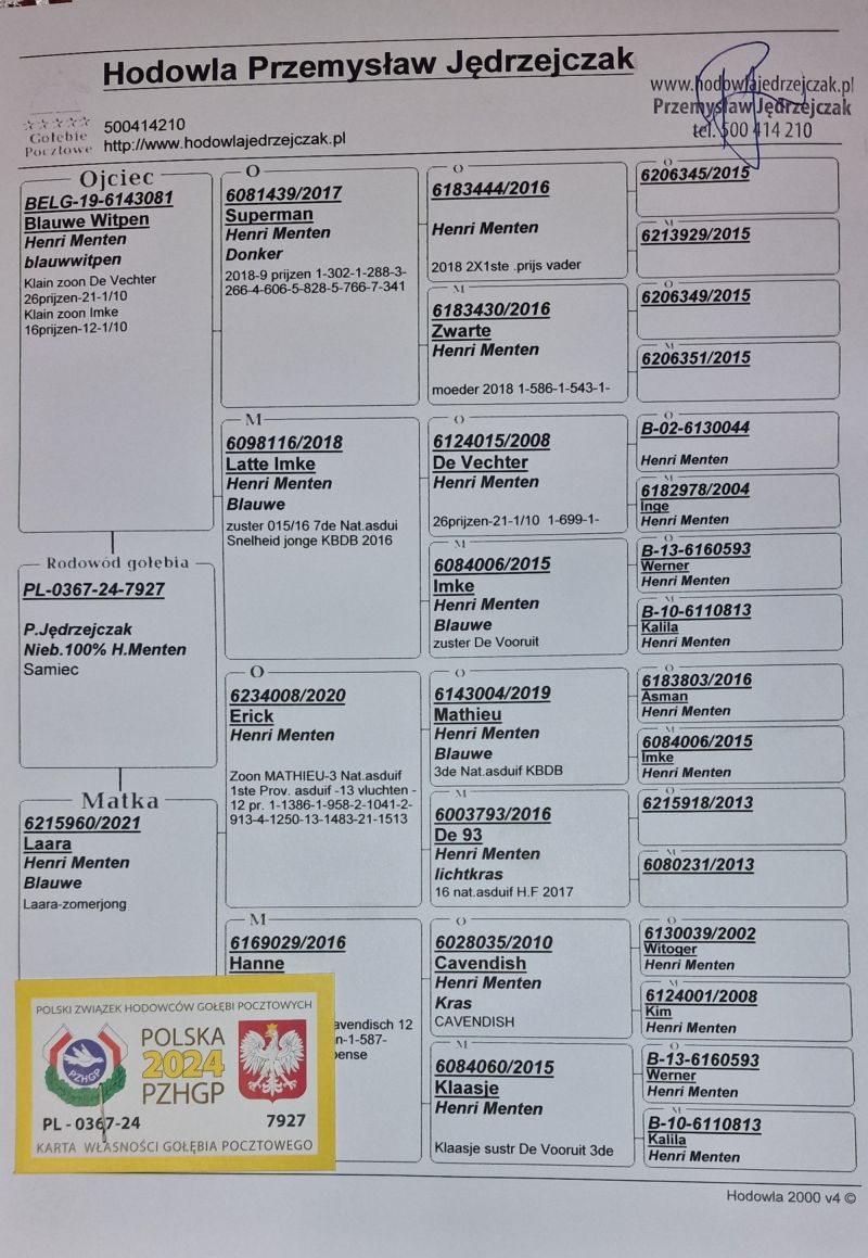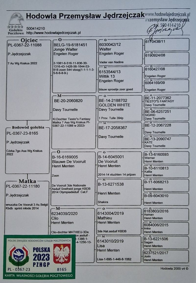 Kontakt: 509898632Opis: Na aukcjach oferuję wszystkie młode przelotowane cały program. Gołębie wylatały w tym roku we wszystkich współzawodnictwach I Vce Mistrza Oddziału (po rocznej przerwie). W 100 lotnikach w Oddziele ok. 40szt. Młode nie zaciemniane, wiosenne. We wcześniejszych latach rodzeństwo lub rodzice wylatały wiele czołowych lokat w tym tytuły Mistrzowskie kat. A, GMP czy OPEN. Gołębie wywodzą się z topowych hodowli (niejednokrotnie bezpośrednio po najlepszych ptakach). Więcej informacji w rodowodach lub pod telefonem 509898632. Płeć gołębia określona orientacyjnie – nie daję 100% pewności. Odbiór osobisty lub po zorganizowaniu transportu (cena do ustalenia).