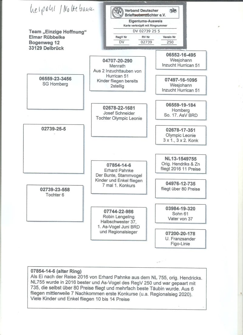 Gołębie ze wspólnego gołębnika UPLAND DERBY Willingen,szczegóły pochodzenia w rodowodzie.Gołębie brały udział w 11 lotach treningowych , 4 konkursowych i 5 lot Finałowy 344km,Więcej informacji pod nr tel.: 603 312 976, transport gołębi po wcześniejszej wpłacie pieniążków na konto .Gołębie będą rozwożone po 07.11.2025 ,koszt transportu 1-3szt-120zł,3-6szt-140zł płatne kurierowi.