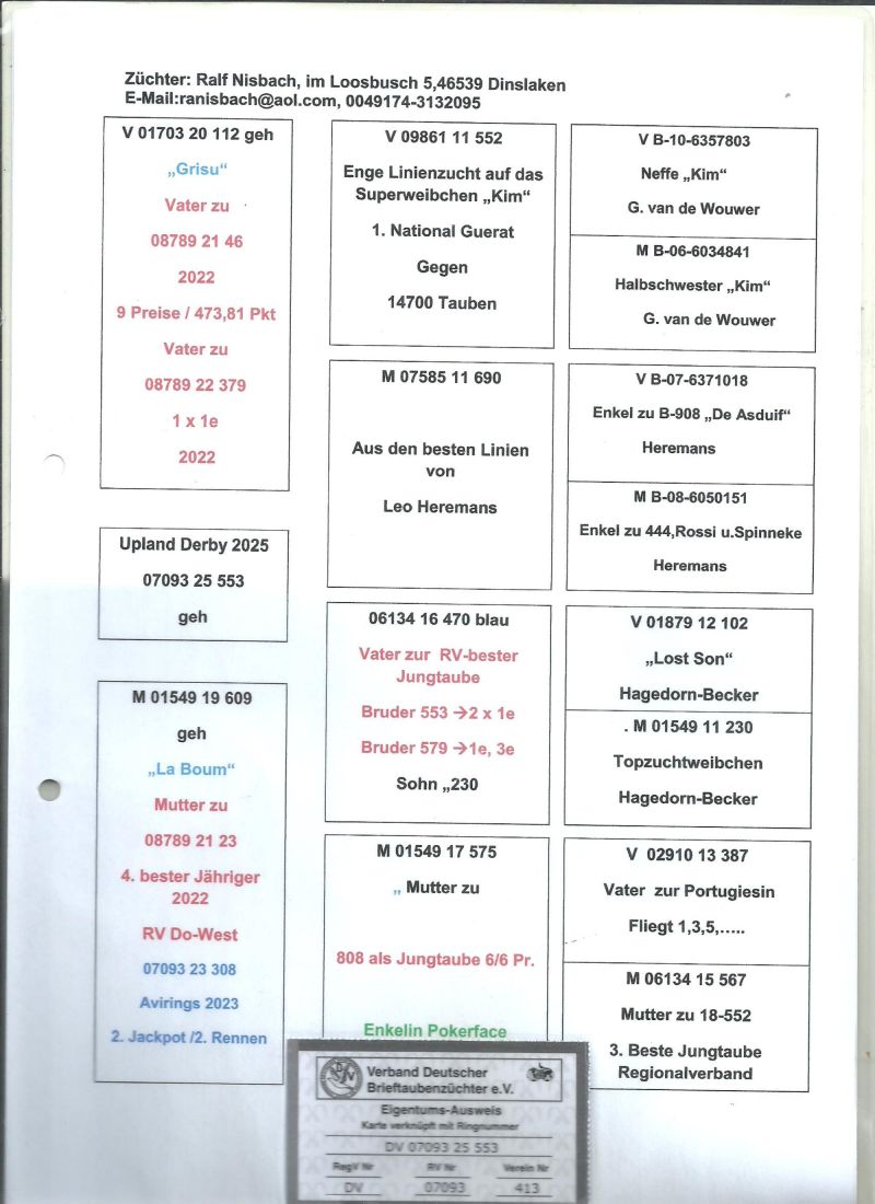 Gołębie ze wspólnego gołębnika UPLAND DERBY Willingen,szczegóły pochodzenia w rodowodzie.Gołębie brały udział w 11 lotach treningowych , 4 konkursowych i 5 lot Finałowy 344km,Więcej informacji pod nr tel.: 603 312 976, transport gołębi po wcześniejszej wpłacie pieniążków na konto .Gołębie będą rozwożone po 07.11.2025 ,koszt transportu 1-3szt-120zł,3-6szt-140zł płatne kurierowi.