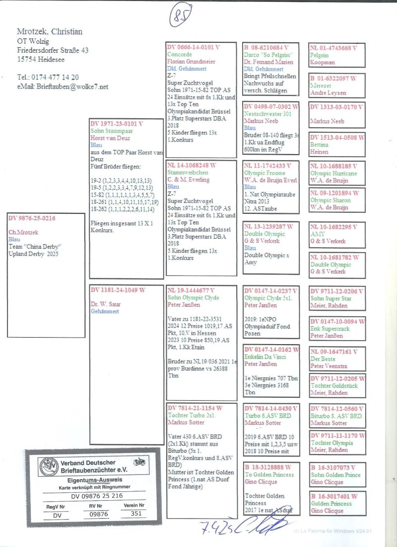 Gołębie ze wspólnego gołębnika UPLAND DERBY Willingen,szczegóły pochodzenia w rodowodzie.Gołębie brały udział w 11 lotach treningowych , 4 konkursowych i 5 lot Finałowy 344km,Więcej informacji pod nr tel.: 603 312 976, transport gołębi po wcześniejszej wpłacie pieniążków na konto .Gołębie będą rozwożone po 07.11.2025 ,koszt transportu 1-3szt-120zł,3-6szt-140zł płatne kurierowi.