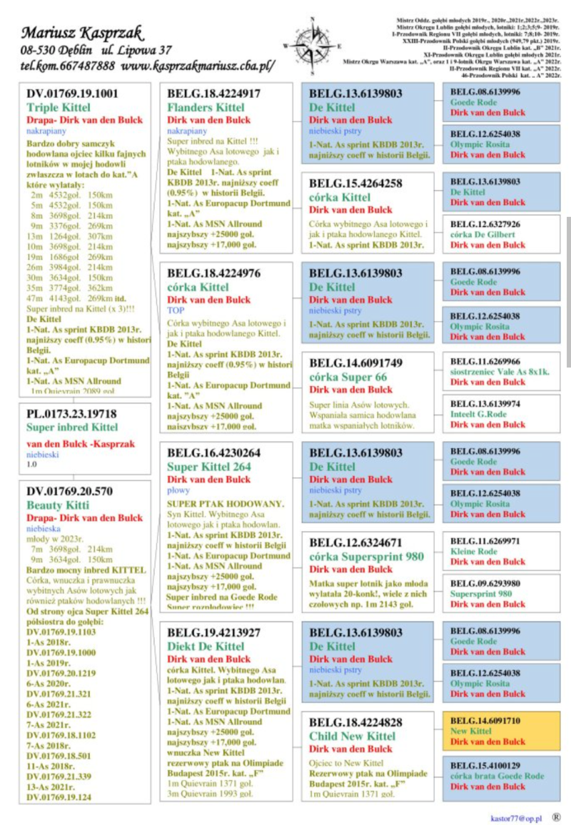 Matka mlodego pochodzi z 100% Dirk van den Bulck (wnuczka De Kittel). Gołąb NIE JEST zaszczepiony. Wychowany w boksie indywidualnym z możliwościa zbadania pokrewieństwa. Szczegóły pochodzenia w rodowodzie. Więcej informacji pod nr: +48577604897