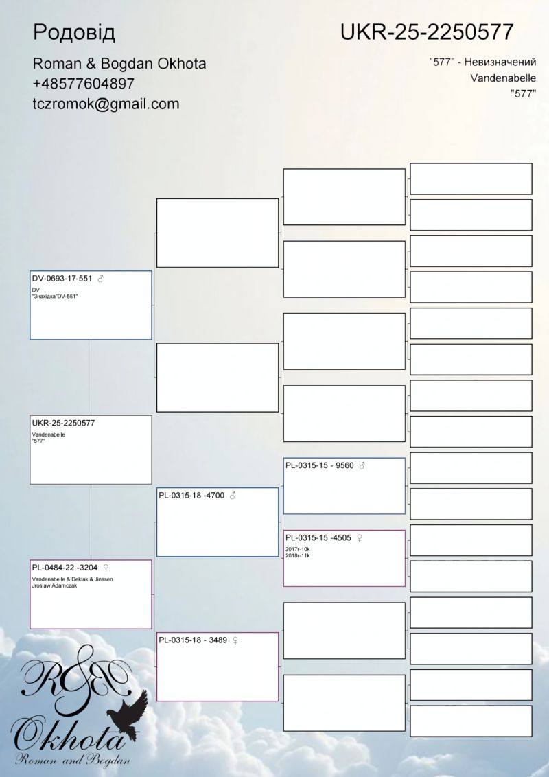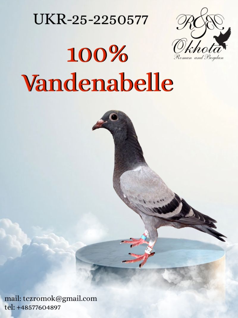 Oryginalny gołąb z hodowli Roman & Bogdan Okhota, z pochodzenia Vandenabeele. Gołąb NIE JEST zaszczepiony. Wychowany w boksie indywidualnym z możliwoscia zbadania pokrewienstwa. Szczegóły pochodzenia w rodowodzie. Więcej informacji pod nr: +48577604897