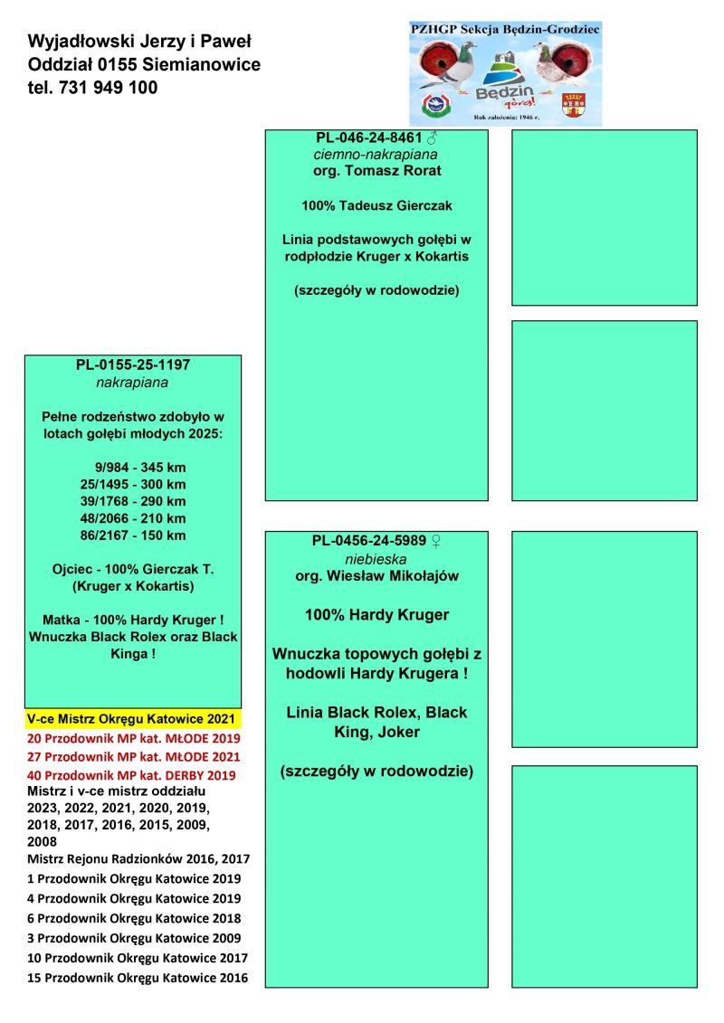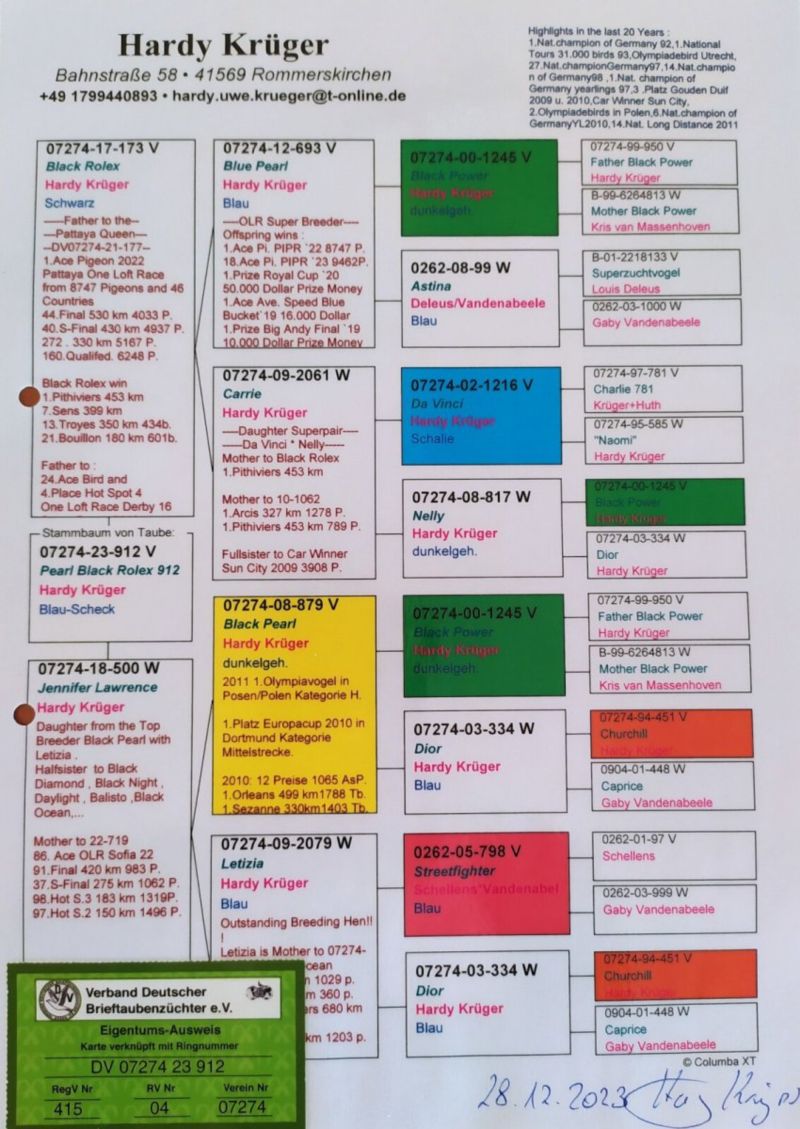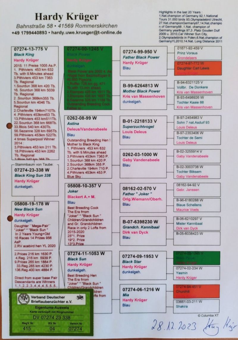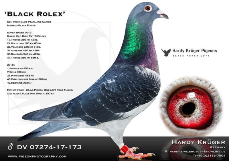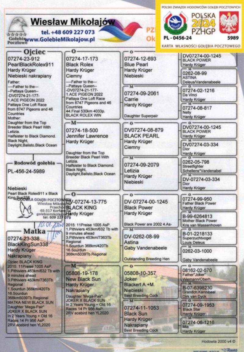Rewelacyjne połączenie wnuczki Black Rolex oraz Black Kinga od Hardy Krugera. Rodzeństwo świetnie spisało się w lotach gołębi młodych w sezonie 2025 zdobywając kilka czołowych konkursów. Szczegóły w rodowodzie i w załączonych materiałach.