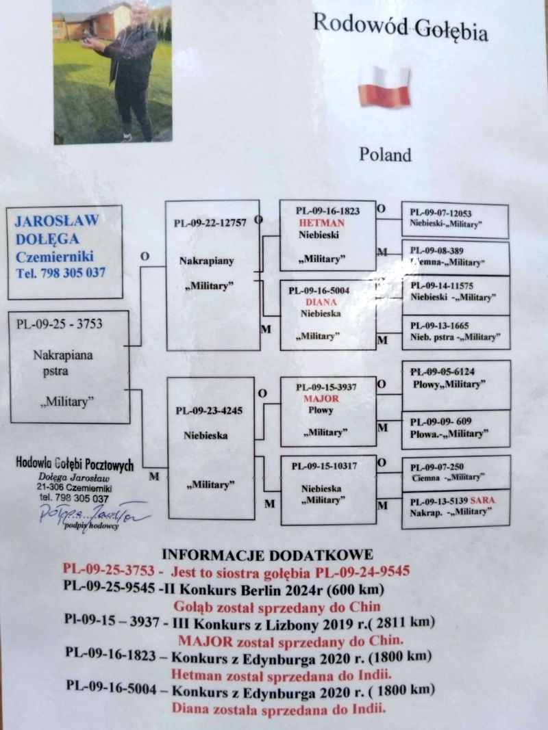 Oryginalny gołąb z hodowli Jarosława Dołęgi. Jest to gołąb młody z 2025 roku. Siostra gołębia zdobyła drugi konkurs z Berlina w lotach gołębi młodych 600 km, została sprzedana do Chin. Więcej informacji w rodowodzie i pod nr tel.798305037. Możliwość wysyłki na terenie Polski.