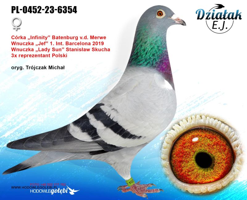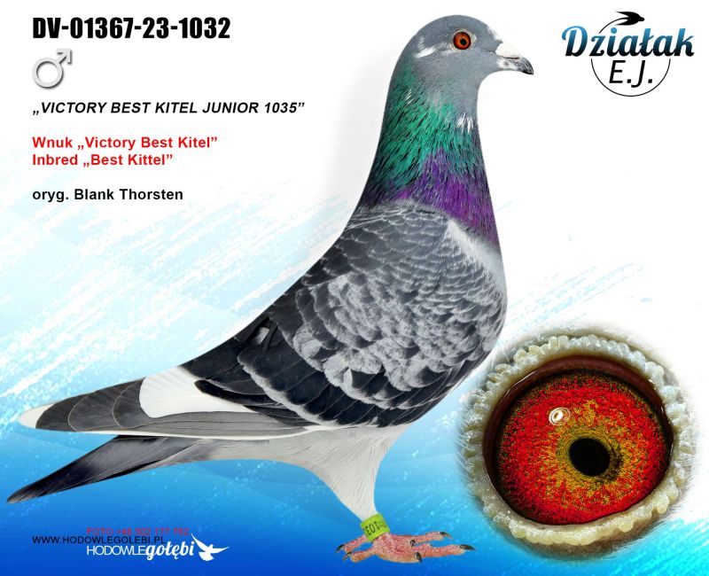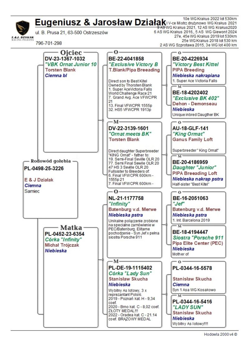 Gołąb całkowicie wypierzony,obecnie ciemny z jednej strony ma dwie białe lotki, wykluty w czerwcu.Ojciec to oryginał Torsten Blank, Matka to córka Infinity od Michała Trójczaka (jego przodkowie to Victory Best Kitel, Ornat, Jef, Lady Sun oraz inne. Więcej informacji w rodowodzie oraz pod numerem telefonu. Możliwość dostarczenia gołębia pod wskazany adres za kwotę 150 zł.