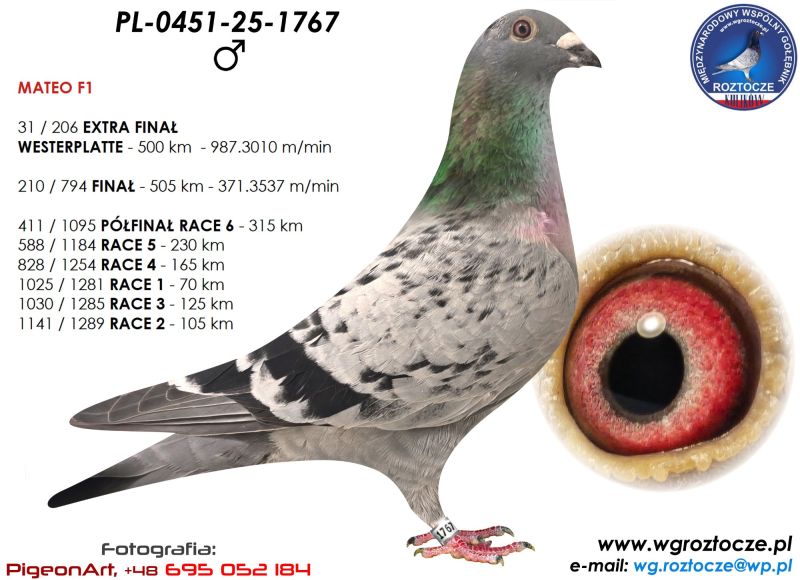 Osiągnięcia lotowe - 35 tytułów Mistrza oddziału Wrocław Sezon 2018 5x 1 gołąb w oddziele Mistrz oddziału kat.A, I Vice mistrz oddziału kat. B Mistrz Okręgu Wrocław kat.A coef.67,09 , I Vice Mistrz Okręgu Wrocław kat. roczne 1,8,11 lotnik okręgu Wrocław kat. A Roczny lotnik do kat.G na wystawę ogólnopolską coef. 11,89 (w ubiegłym sezonie lotowym byłby to 5 wynik w Polsce ) Wybrane loty : Zielona Góra 145 km, oddział włożył 3452 gołębie, koszowałem 62goł/40k : 1,2,4,17,18,20,21,23,24,35,38,40,55,56,57,67,72,74,75,85,86,itd Krosno odżańskie 178km, oddział włożył 3582 gołębie, koszowałem 57goł/40k : 1,11,12,13,15,23,33,35,39,42,43,45,50,50,58,62,67,81,94,itd... Furstenwalde 252km, oddział włożył 3398 gołębi, koszowałem 56/39k : 3,10,15,24,30,47,49,63,84,85,itd.. Michendorf 1 oddział włozył 3182gołębie, koszowałem 56/37k : 1,8,9,10,24,26,27,41,43,55,56,57,60,62,70,74,80,88,89,91,95itd... Michendorf 4 314km, oddział włożył 1415 gołębi koszowałem 20/14k :1,2,4,14,30,37,41,58,66,78itd... Najlepsze lotniki kat.A Coef. 1.17 , 6.23 , 7.59 , 16.09 , 16.99 , 18.76 , Największa wydolność % w oddziale po wszystkich lotach 53,1%. 17 razy gołąb w pierwszej dziesiątce list oddziałowej z tego 5 razy 1 gołąb. 2 As Polski kat. roczne w / g biuletynu „Dobry Lot” 5 As Polski kat. A w /g biuletynu „Dobry Lot” 13 As Polski kat . G wystawa ogólnopolska Sosnowiec 13 As Polski kat. D wystawa ogólnopolska Sosnowiec Sezon 2019 Mistrz Oddziału kat.A Okręg Wrocław 7 miejsce kat. A. Największa wydolność procentowa w oddziele - 55,7% 2018 drugi lotnik Polski w/g biuletynu dobry lot kat. roczne. Wystawa ogólnopolska Sosnowiec 2019 12 As Polski kat. G oraz 13 As Polski kat. D. Sezon 2019 – wybrane loty : Zielona Góra 145km - oddział włożył 2875 gołębi, koszowałem 33 goł/9k : 7,16,49, itd… Krosno Odrzańskie 178km - oddział włożył 2924 gołębie, koszowałem 28goł/22k : 1,2,3,12,13,14,15,16,19,24,25,26,27,28,30,46,99, itd…. 1 Seria z całości, 1 seria z 50, Klasyfikacja po dwóch lotach : 1 Miejsce gołębie typowane 2 Miejsce klasyfikacja z 50, Michendorf 1 314km – oddział włożył 2787 gołębi, koszowałem 27goł/19k : 1,8,10,11,16,17,31,42,47,48,77,78,itd. 1 Seria z całości, 1 seria z 50, 1 seria typowana, 1 seria GMP, 1 seria intermistrzostwo, 4 x 1 gołąb w oddziele.