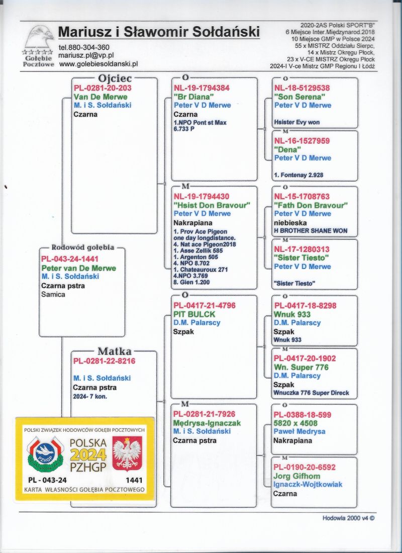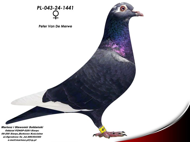 Oryginalna samiczka z hodowli Mariusz i Sławomir Sołdański . Gołąbek pochodzi z linii gołębi Petera van De Merwe. Więcej informacji o gołębiu pod nr tel. i poniższych materiałach. Nasze wyniki w Mistrzostwie Polski 2018: 6 Miejsce w Intermistrzostwie Międzynarodowym - coeff. 151,73; 23 Miejsce GMP - 1874,73; 29 Miejsce Kat.B - coeff. 86,45. 1 Miejsce Gołąb Średni dystans-Konkurs Redakcji "Hodowca", 1 Miejsce Kat."B"-Konkurs Redakcji "Dobry Lot", 3 Miejsce Kat."D"-Konkurs Redakcji "Dobry Lot", 2 Miejsce "Mistrzostwo Asów Allround"-Konkurs Redakcji "Dobry Lot", 1 Miejsce Kat."B"-Konkurs Redakcji "Poradnik Hodowcy". 2019-Oddział Sierpc: Typowane Mistrz, Open I-vce Mistrz, Open 50 II-V-ce Mistrz, 1 i 3 Lotnik Roczny, Kat. A II V-ce Mistrz, Kat. B II V-ce Mistrz, Kat. D II V-ce Mistrz, Kat. GMP I v-Ce Mistrz, Kat. Inter. I V-ce Mistrz, Super. I V-ce Mistrz. Okręg Płock: II V-ce Mistrz Supermistrzostwo, I V-ce Mistrz GMP, II Lotnik. kat. B. 10 Gołębi w Reprezentacji Okręgu na Wystawę Ogółnopolską 2020. 2 AS POLSKI SPORT „B”-14,62 coef. 2020-Oddział Sierpc: Typowane Mistrz, Open I-vce Mistrz, Open 50 I-V-ce Mistrz, 1 Lotniczka Roczna, Kat. C Mistrz, Kat. M II V-ce Mistrz, Kat. D II V-ce Mistrz, Kat. GMP Mistrz, Kat. Inter. II V-ce Mistrz, Mistrz. Okręg Płock: Kat. GMP Mistrz , Kat.Roczne Mistrz, Kat. C-I Vce Mistrz , Kat. M - I Vce Mistrz Mistrz.Regionu I Łódż- V-ce Mistrz „Roczne” 2021- Supermistrz Oddziału Sierpc Mistrz Okręgu Płock Kat." Maraton" Supermistrz Okręgu Płock,2022 6 gołębi w reprezentacji Okręgu Płock na Wystawę Ogólnopolską.2022- II Supermistrz Oddziału Sierpc, 8 x V-ce Mistrz Oddziału. 1 AS WG Kaszuby 2022, 2 drużyna WG Kosakowo 2022, 4 AS WG Kosakowo. 6 AS WG Roztocze 2022. 6 gołębi w reprezentacji Okręgu Płock na Wystawę Ogólnopolską 2023. 2022-1 Samica w Polsce PL-0281-17-3077 w Kat. "Supermaraton"- Konkurs Redakcji"Hodowca". 2024 - 10 Miejsce w Polsce w kat. GMP 1 Miejsce Finał Wg Zatoka Puck 3 i 6 As Zatoka Puck