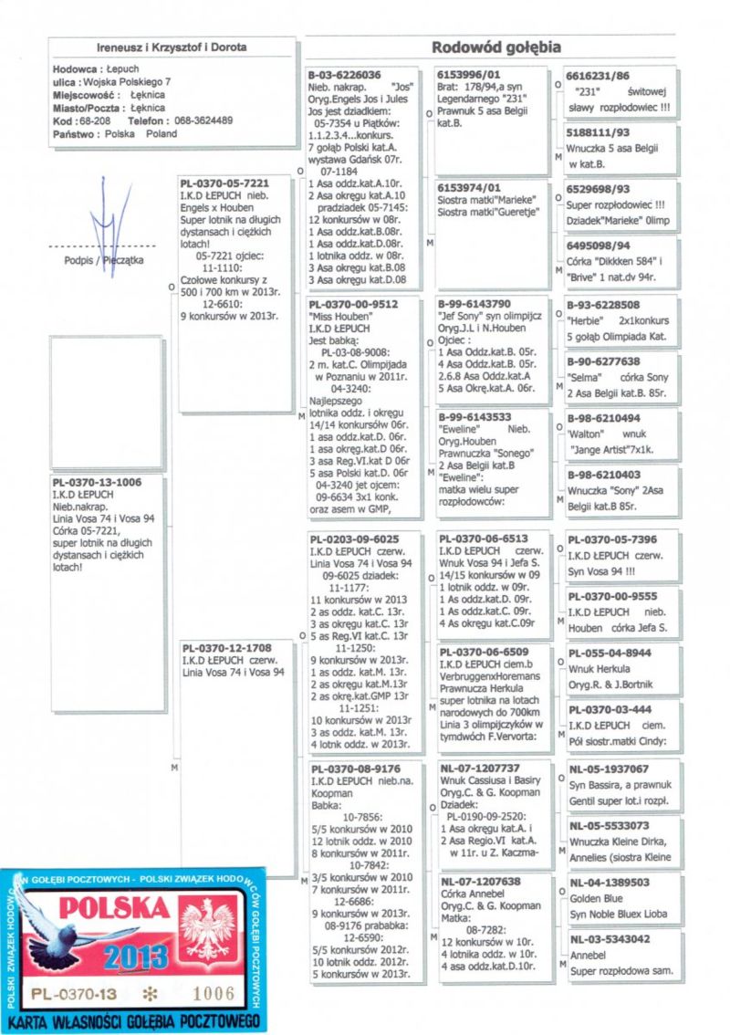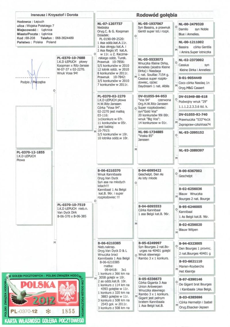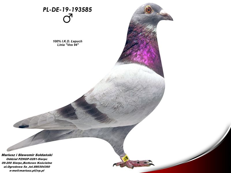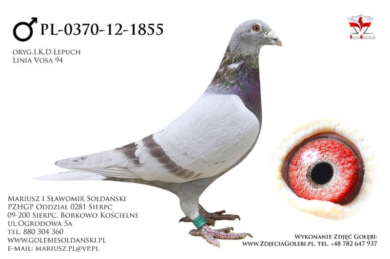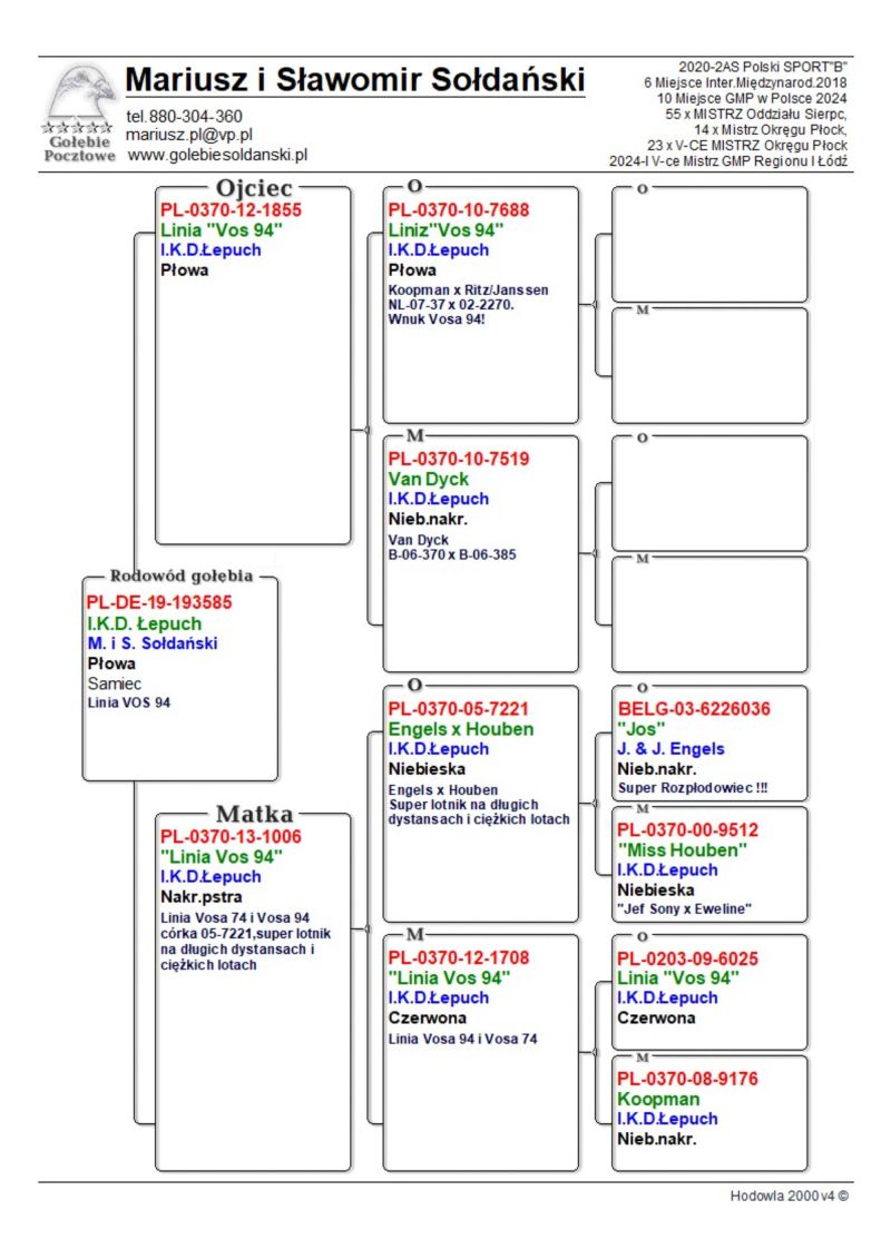 Oryginalny samczyk z hodowli M. i S. Sołdańscy super Linia "Vos 94" I.K.D. Łepuch . Więcej informacji o gołębiu pod nr tel. i poniższych materiałach. Nasze wyniki w Mistrzostwie Polski 2018: 6 Miejsce w Intermistrzostwie Międzynarodowym - coeff. 151,73; 23 Miejsce GMP - 1874,73; 29 Miejsce Kat.B - coeff. 86,45. 1 Miejsce Gołąb Średni dystans-Konkurs Redakcji "Hodowca", 1 Miejsce Kat."B"-Konkurs Redakcji "Dobry Lot", 3 Miejsce Kat."D"-Konkurs Redakcji "Dobry Lot", 2 Miejsce "Mistrzostwo Asów Allround"-Konkurs Redakcji "Dobry Lot", 1 Miejsce Kat."B"-Konkurs Redakcji "Poradnik Hodowcy". 2019-Oddział Sierpc: Typowane Mistrz, Open I-vce Mistrz, Open 50 II-V-ce Mistrz, 1 i 3 Lotnik Roczny, Kat. A II V-ce Mistrz, Kat. B II V-ce Mistrz, Kat. D II V-ce Mistrz, Kat. GMP I v-Ce Mistrz, Kat. Inter. I V-ce Mistrz, Super. I V-ce Mistrz. Okręg Płock: II V-ce Mistrz Supermistrzostwo, I V-ce Mistrz GMP, II Lotnik. kat. B. 10 Gołębi w Reprezentacji Okręgu na Wystawę Ogółnopolską 2020. 2 AS POLSKI SPORT „B”-14,62 coef. 2020-Oddział Sierpc: Typowane Mistrz, Open I-vce Mistrz, Open 50 I-V-ce Mistrz, 1 Lotniczka Roczna, Kat. C Mistrz, Kat. M II V-ce Mistrz, Kat. D II V-ce Mistrz, Kat. GMP Mistrz, Kat. Inter. II V-ce Mistrz, Mistrz. Okręg Płock: Kat. GMP Mistrz , Kat.Roczne Mistrz, Kat. C-I Vce Mistrz , Kat. M - I Vce Mistrz Mistrz.Regionu I Łódż- V-ce Mistrz „Roczne” 2021- Supermistrz Oddziału Sierpc Mistrz Okręgu Płock Kat." Maraton" Supermistrz Okręgu Płock,2022 6 gołębi w reprezentacji Okręgu Płock na Wystawę Ogólnopolską.2022- II Supermistrz Oddziału Sierpc, 8 x V-ce Mistrz Oddziału. 1 AS WG Kaszuby 2022, 2 drużyna WG Kosakowo 2022, 4 AS WG Kosakowo. 6 AS WG Roztocze 2022. 6 gołębi w reprezentacji Okręgu Płock na Wystawę Ogólnopolską 2023. 2022-1 Samica w Polsce PL-0281-17-3077 w Kat. "Supermaraton"- Konkurs Redakcji"Hodowca". 2024 - 10 Miejsce w Polsce w kat. GMP 1 Miejsce Finał Wg Zatoka Puck 3 i 6 As Zatoka Puck