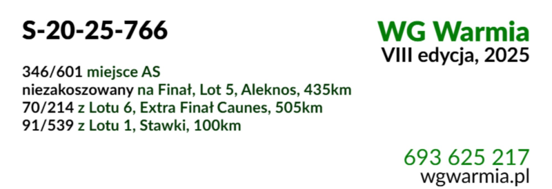 Uczestnik WG Warmia 2025, sezon VIII. Loty z kierunku północny wschód, Litwa. Wrócił po Finale, 346 AS, 70 z Extra Finału. Szczegóły pochodzenia w rodowodzie.