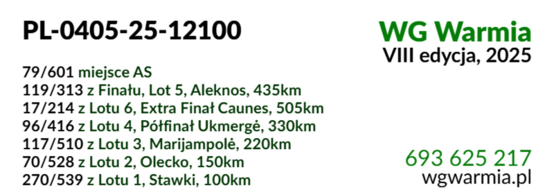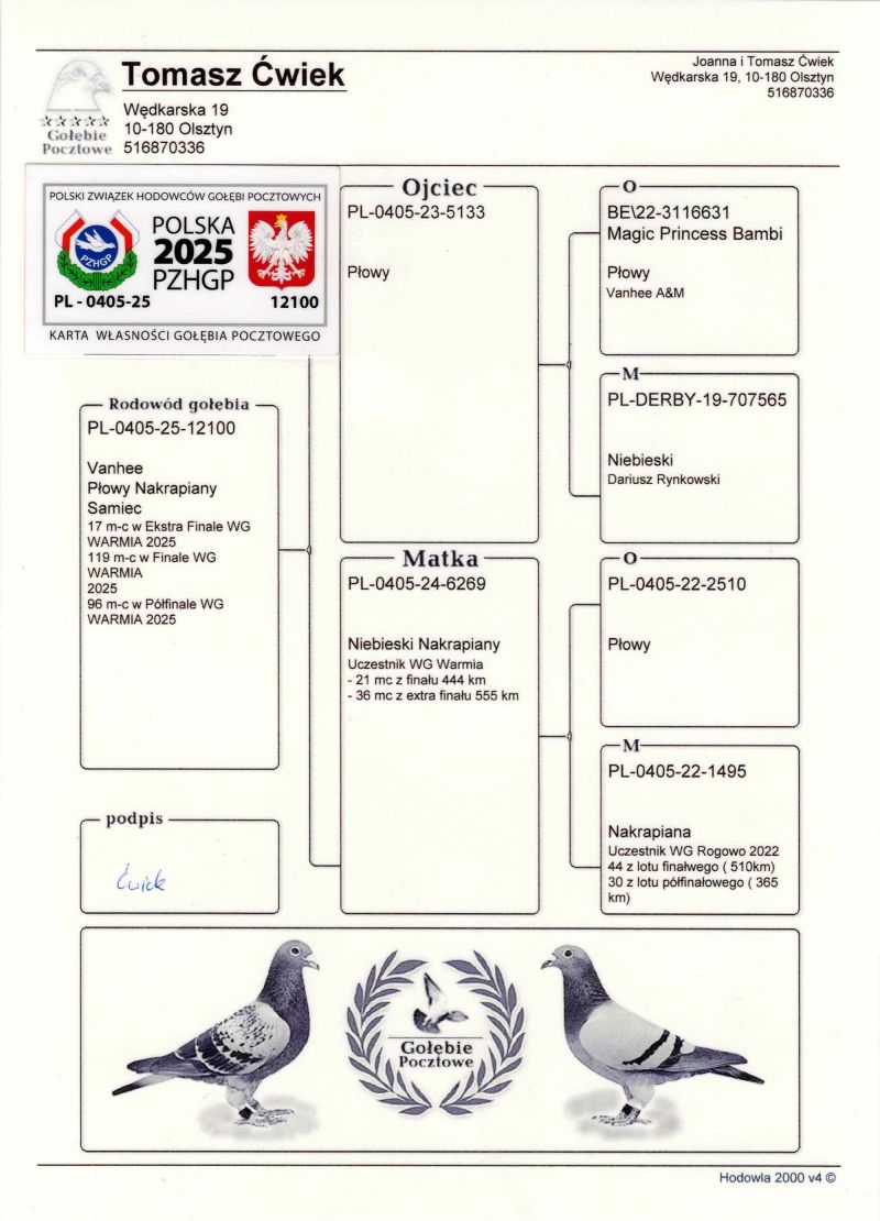 Opis: Uczestnik WG Warmia 2025, sezon VIII. Loty z kierunku północny wschód, Litwa. 119 z Finału, 79 AS, 17 z Extra Finału. Szczegóły pochodzenia w rodowodzie.