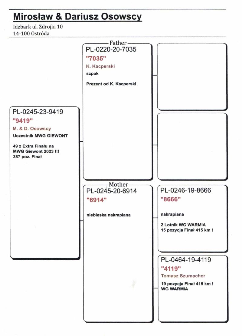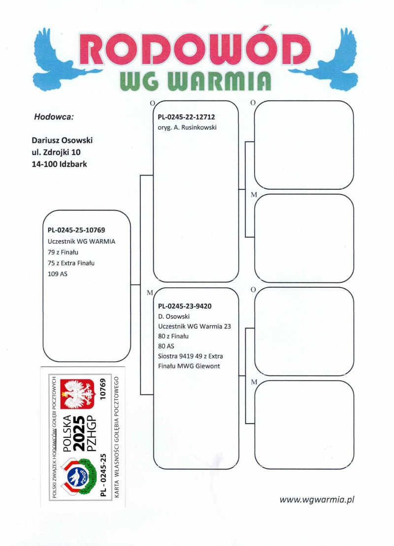 Opis: Uczestnik WG Warmia 2025, sezon VIII. Loty z kierunku północny wschód, Litwa. 79 z Finału, 109 AS, 75 z Extra Finału. Szczegóły pochodzenia w rodowodzie.
