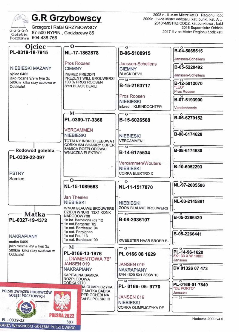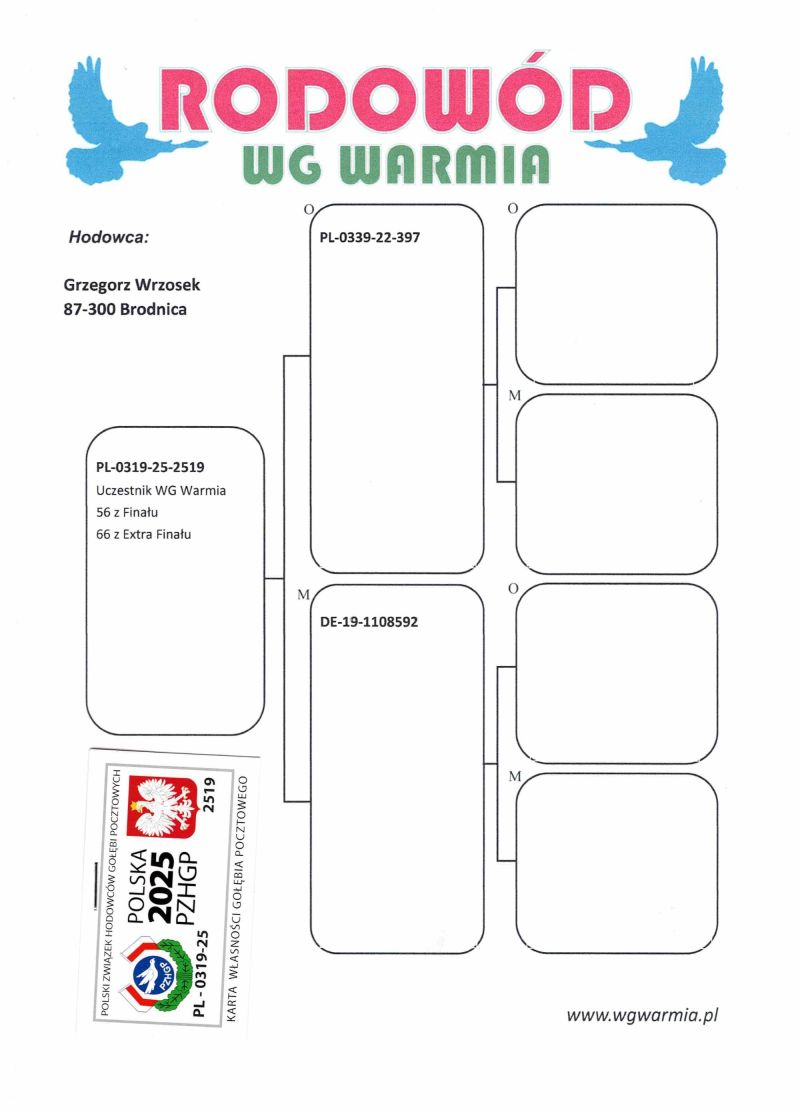 Opis: Uczestnik WG Warmia 2025, sezon VIII. Loty z kierunku północny wschód, Litwa. 56 z Finału, 180 AS, 66 z Extra Finału. Szczegóły pochodzenia w rodowodzie.