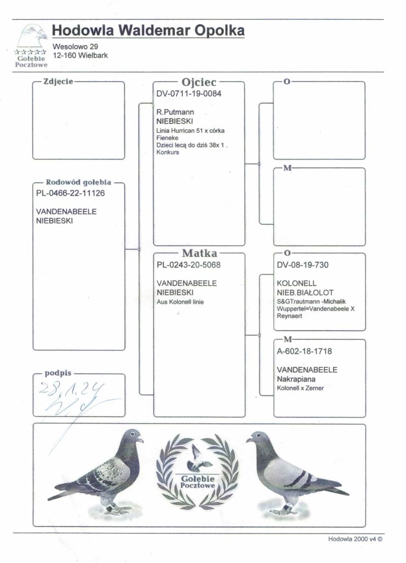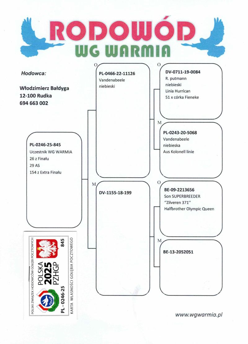 Uczestnik WG Warmia 2025, sezon VIII. Loty z kierunku północny wschód, Litwa. 26 z Finału, 29 AS, 154 z Extra Finału. Szczegóły pochodzenia w rodowodzie.