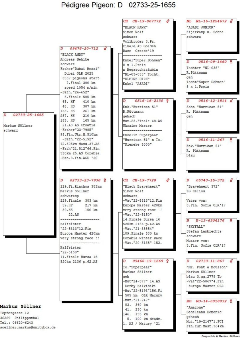 Szczegóły pochodzenia w rodowodzie. Pełne wyniki gołębia w sezonie lotowym na stronie: