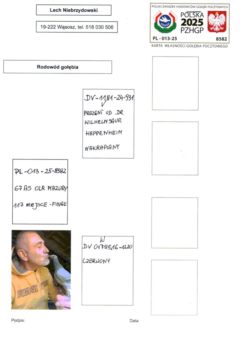 Opis: Gołąb PL-013-25-8582 - uczestnik 8 edycji OLR Mazury 2025. Ukończył cały program tegorocznej edycji. 117 miejsce z finału, 67 AS OLR Mazury. Szczegóły pochodzenia w rodowodzie. Pełne wyniki gołębia w sezonie lotowym na stronie: oneloftrace.live/lofts/148/teams/4335043/pigeons/33950049 Zapraszamy do licytacji.