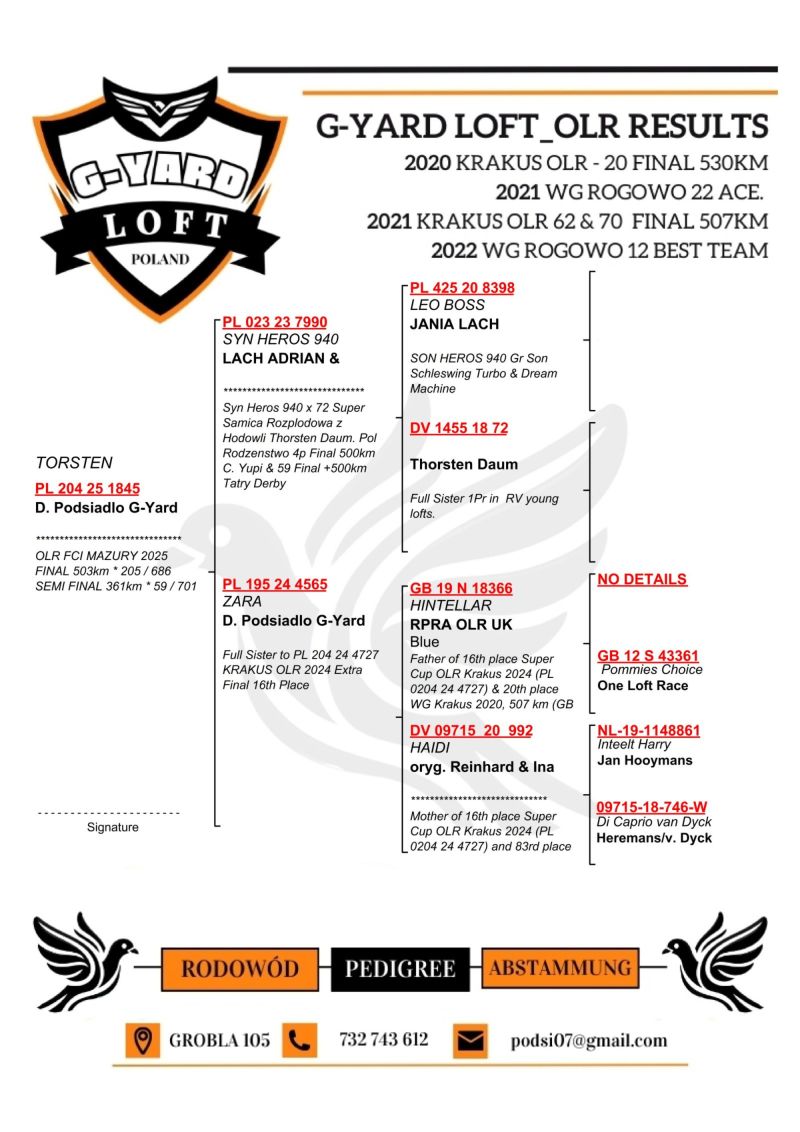 Szczegóły pochodzenia w rodowodzie. Pełne wyniki gołębia w sezonie lotowym na stronie: