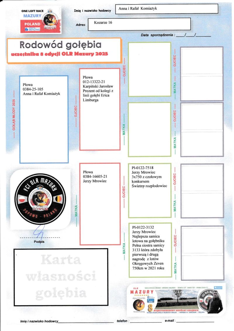 Gołąb PL-0384-25-105 - uczestnik 8 edycji OLR Mazury 2025. Ukończył cały program tegorocznej edycji. 165 miejsce z finału, 109 AS OLR Mazury.