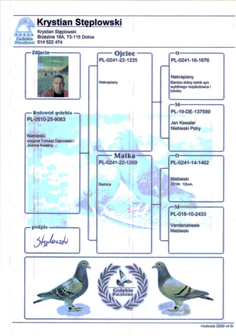 Szczegóły pochodzenia w rodowodzie. Pełne wyniki gołębia w sezonie lotowym na stronie: