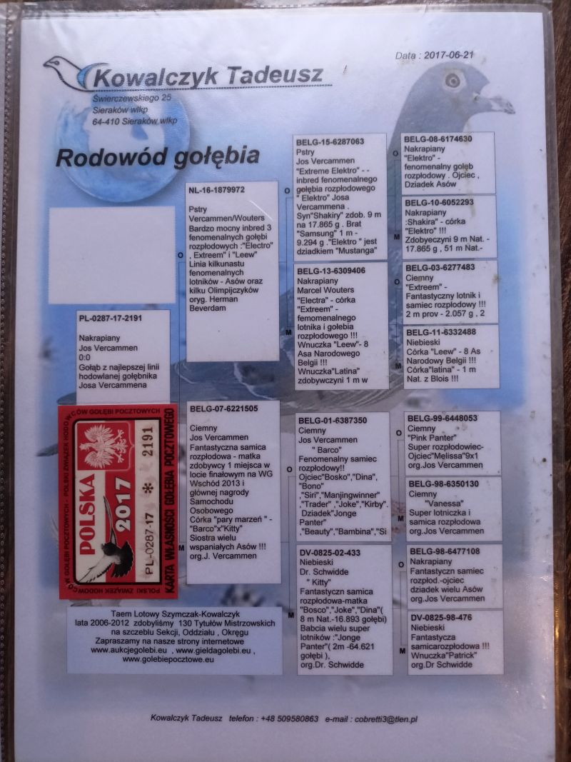LIKWIDACJA HODOWLI Oryginalny gołąb z hodowli Tadeusza Kowalczyka. Szczegóły pochodzenia w rodowodzie. Więcej informacji pod nr tel.: 730602025 **Odbiór osobisty lub po uzgodnieniu transportu