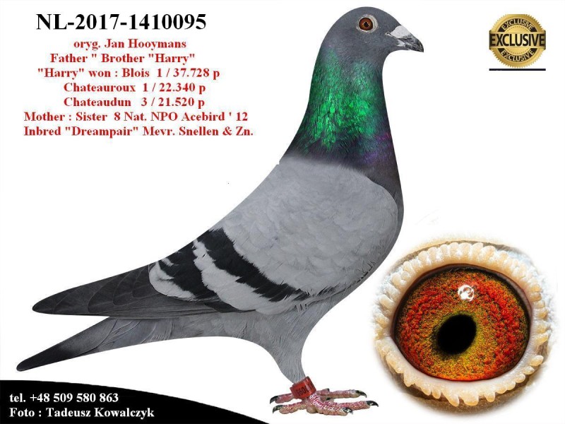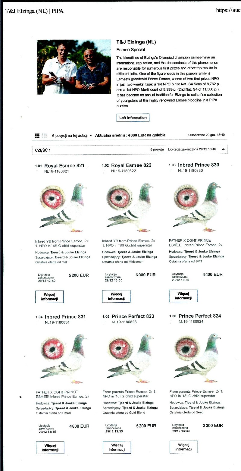 Kontakt: 509 580 863Opis: AUKCJA PROMOCYJNA ROCZNIKA 2025 (Cena obowiązuje wyłącznie na tej aukcji) Profesjonalna hodowla z wieloletnim doświadczeniem, posiadająca w swoim stadzie materiał najwyższej światowej klasy, wywodzący się od takich hodowców jak: Jan Hooymans, Gerard Koopman, Mike Ganus, Tjeerd & Jouke Elzinga, Gino Clicque, Jos Vercammen, Jelle Roziers, Bart Geerinckx, Batenburg – v/d Merwe, Altmiks – Pigeons, Jo & Florian Hendriks, Kornelis Winner Loft – linia „Romario”, W & F Ebben, Bert Braspenning, Dirk van den Bulck, Peter v/d Merwe, Jan van de Pasch, Van Elsacker-Jepsen, Roger Desmet – Matthijs, Arie Dijkstra, Leo Heremans, Pieter Veenstra, Gaby Vandenabeele, Karl-Heinz Wichert, Hardy Kruger, Helmut & Alfons Klaas, Gebr. Janssen. Najwyższej klasy materiał hodowlany – najlepsze linie danych Hodowców