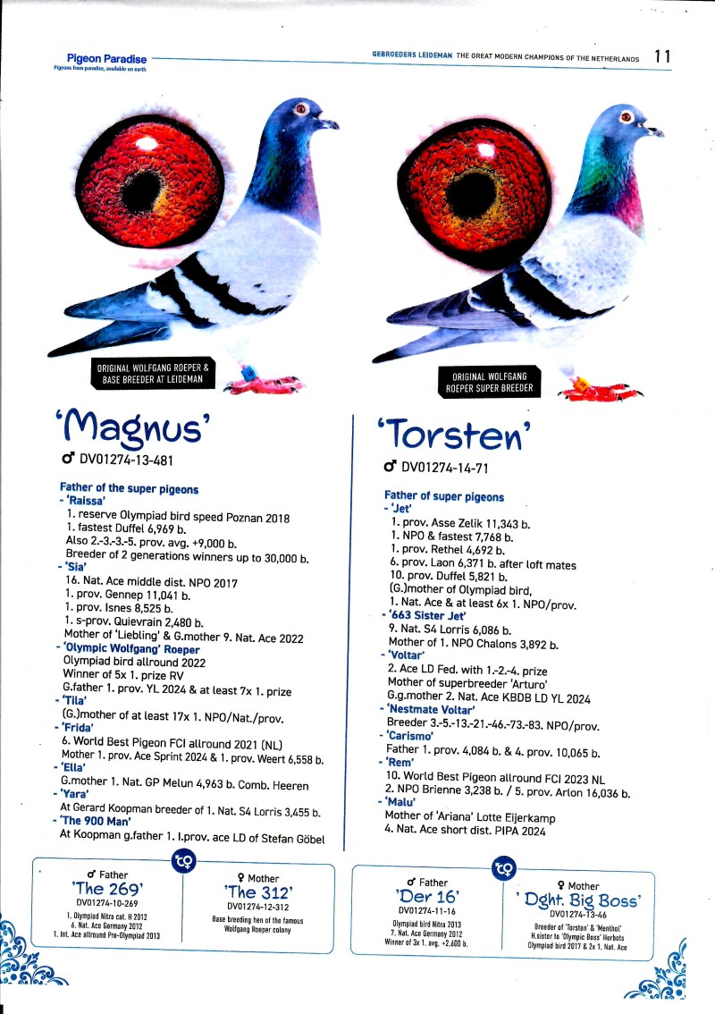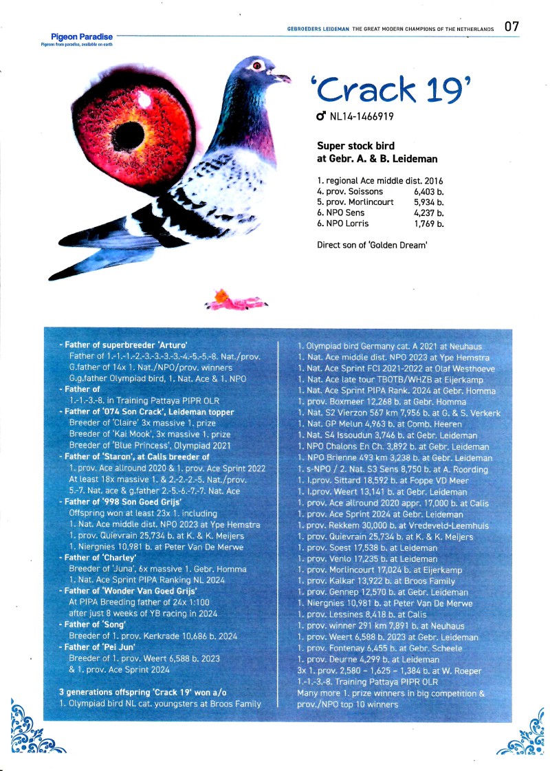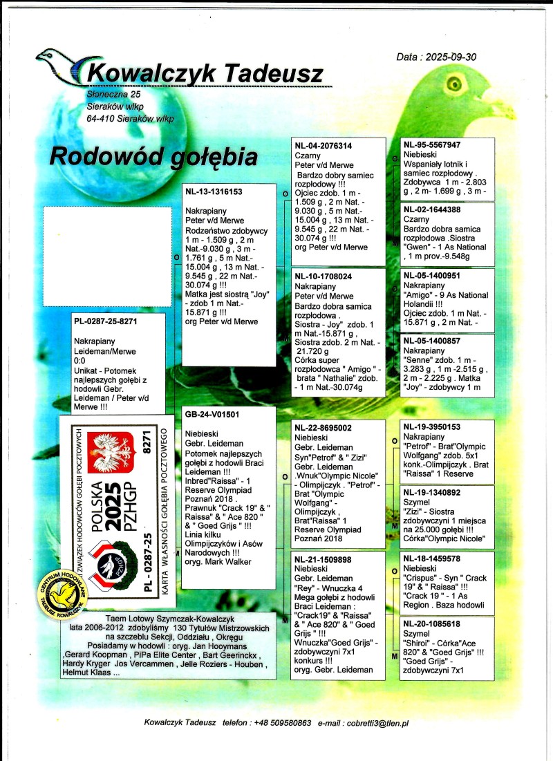 AUKCJA PROMOCYJNA ROCZNIKA 2025 (Cena obowiązuje wyłącznie na tej aukcji) Profesjonalna hodowla z wieloletnim doświadczeniem, posiadająca w swoim stadzie materiał najwyższej światowej klasy, wywodzący się od takich hodowców jak: Jan Hooymans, Gerard Koopman, Mike Ganus, Tjeerd & Jouke Elzinga, Gino Clicque, Jos Vercammen, Jelle Roziers, Bart Geerinckx, Batenburg – v/d Merwe, Altmiks – Pigeons, Jo & Florian Hendriks, Kornelis Winner Loft – linia „Romario”, W & F Ebben, Bert Braspenning, Dirk van den Bulck, Peter v/d Merwe, Jan van de Pasch, Van Elsacker-Jepsen, Roger Desmet – Matthijs, Arie Dijkstra, Leo Heremans, Pieter Veenstra, Gaby Vandenabeele, Karl-Heinz Wichert, Hardy Kruger, Helmut & Alfons Klaas, Gebr. Janssen. Najwyższej klasy materiał hodowlany – najlepsze linie danych Hodowców