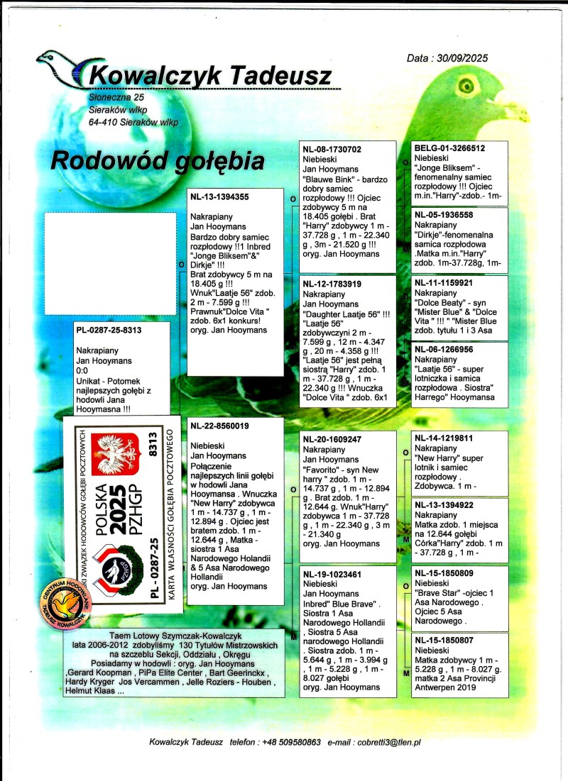 PL-0287-25-8313 - Unikat - Potomek najlepszych gołębi z hodowli Jana Hooymansa