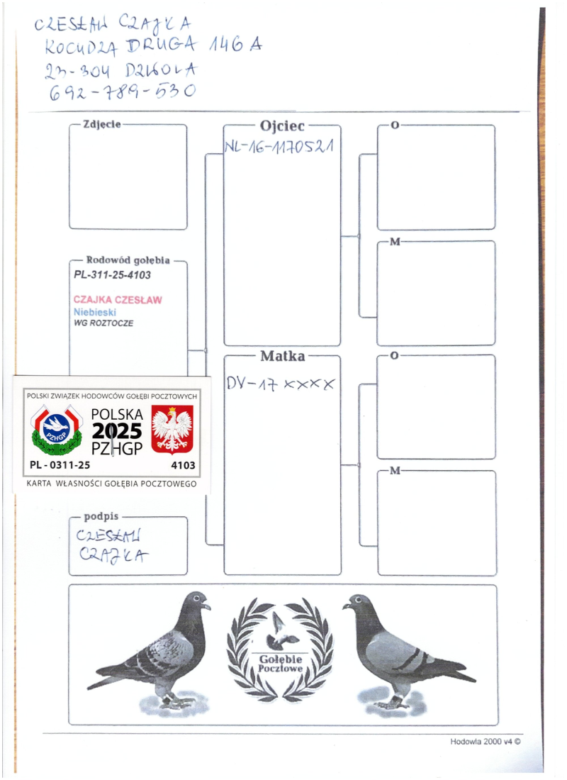 Płeć: samica Hodowca - rasa: Oryg.CZAJKA CZESŁAW Trzech Kolegów Zakończenie: 19.10.2025 godz. 21:39