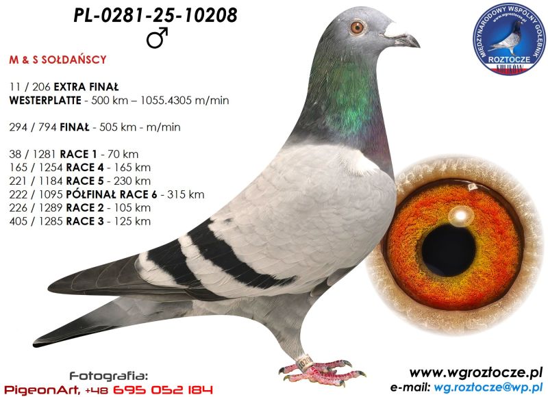 Opis: Gołąbek po całym bardzo wymagającym programie na WG ROZTOCZE 2025 loty pod wiatr lub boczny. 8 Lotów Konkursowych 2015 kkm zdobywając 294 miejsce z Finału 505km i 11 miejsce Extra Finał 500km. więcej info.w rodowodzie i na stronie Benzing Live.oneloftrace.live/lofts/260?season=2458&tab=flights zapraszamy na sezon 2026.