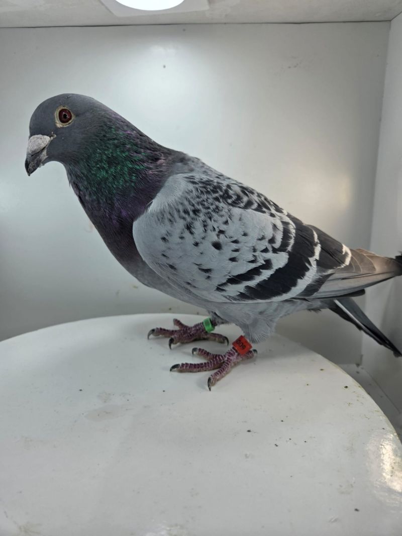 Samczyk w trakcie pierzenia. Oryginalny gołąb z hodowli Wiesław Czupryn. Więcej informacji w rodowodzie bądź pod numerem telefonu 602840038. Przed licytacja proszę o kontakt w sprawie dogadania
