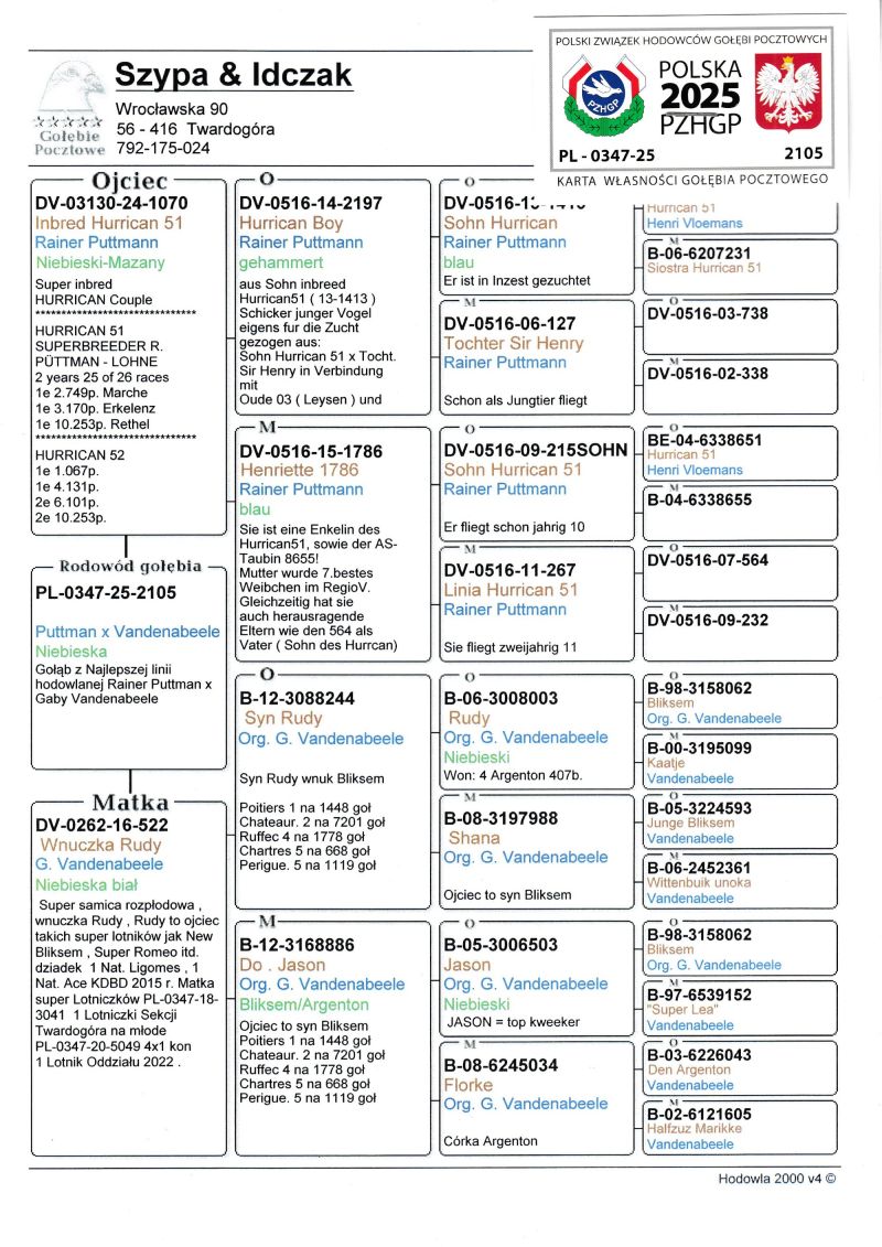 Profesjonalna hodowla z wieloletnim doświadczeniem, posiadająca w swoim stadzie materiał najwyższej światowej klasy. Więcej informacji w załączonych materiałach oraz pod nr tel. 792-175-024 Oferowany gołąb to prawdopodobnie SAMICA. Płeć pisana orientacyjnie