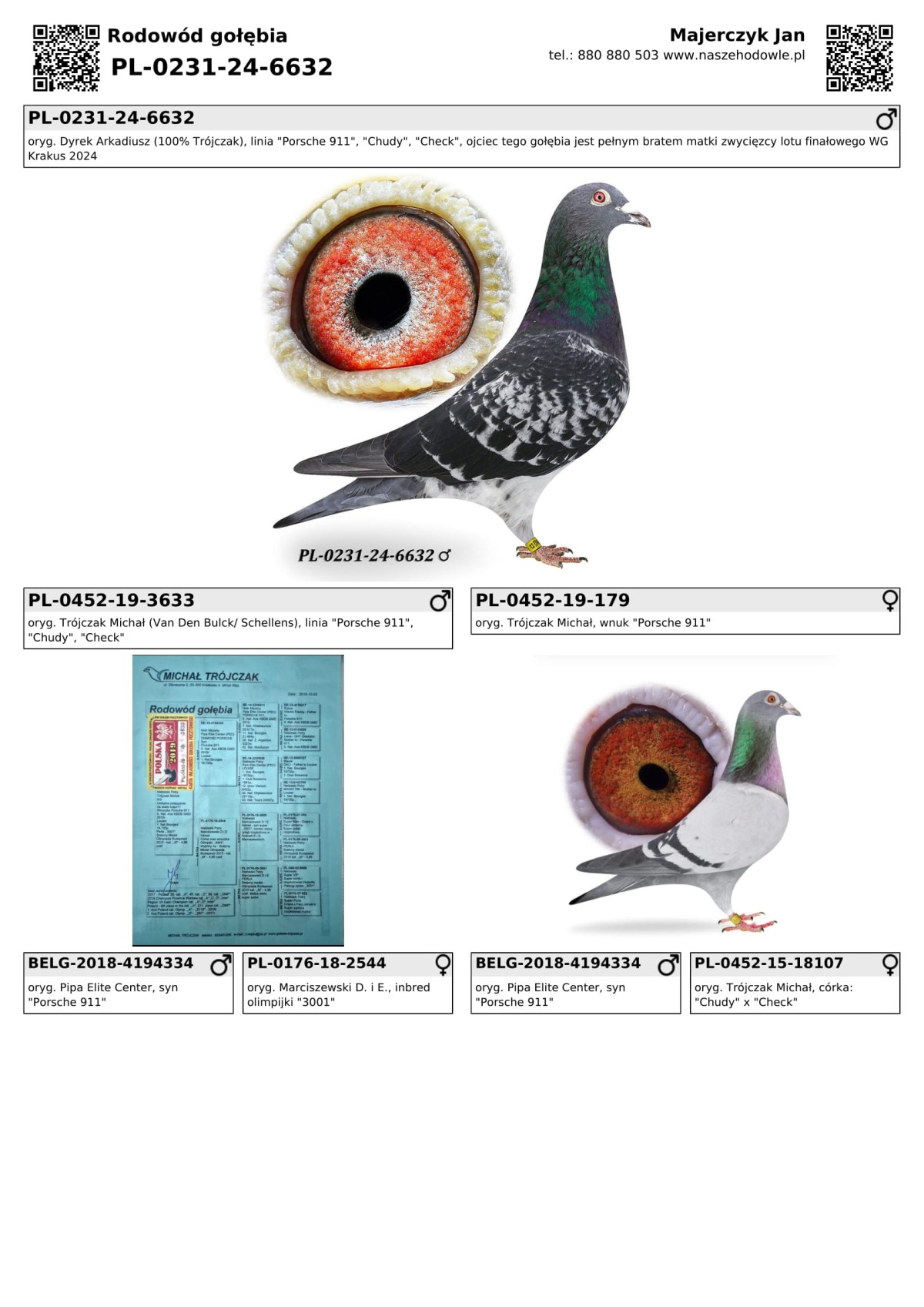 Opis: oryg. Dyrek Arkadiusz (100% Trójczak), linia "Porsche 911", "Chudy", "Check", ojciec tego gołębia jest pełnym bratem matki zwycięzcy lotu finałowego WG Krakus 2024. Szczegóły pochodzenia w rodowodzie i załączonych materiałach. Więcej informacji o gołębiu pod nr tel.: 880 880 503. Gołąb z gołębnika kol. Jana Majerczyka - Oddział Zakopane.