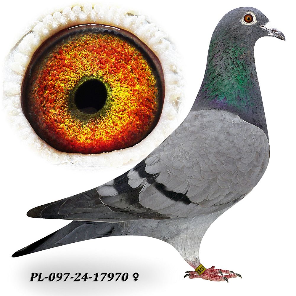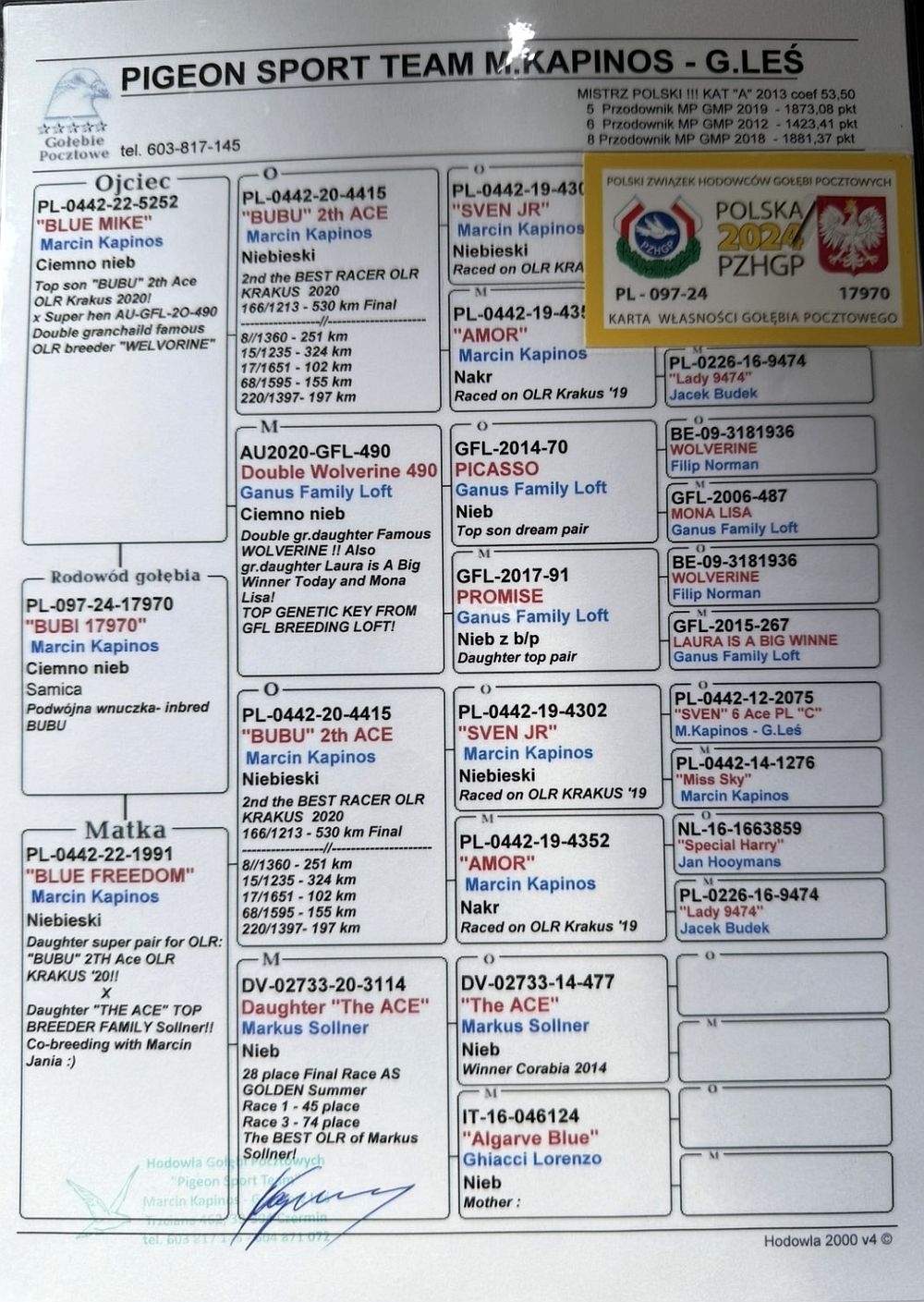 PL-097-24-17970 - oryg. Pigeon Sport Team M. Kapinos - G. Leś, córka: "Blue Mike" x "Blue Freedom", młody z tej samicy zdobył 4k./5wkł. w Oddziale PZHGP Zakopane