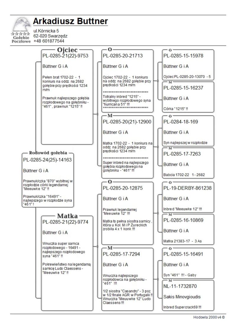 Super szpaczek, pokrewieństwo na mojego najlepszego gołębia rozpłodowego w historii hodowli - "461" Linia "1215" - najlepszego syna Hurricana 51 w Polsce, linia super rozpłodowego sanmca Ludo Claessens - Felle 040 oraz dwóch córek Meeuwke 12 od Ludo Claessens - "870" i "327" !! "17913" (syn 1215)- najlepszy mój samiec rozpłodowy jeżeli chodzi o WG i nie tylko samiczka 6334-14 najlepiej punktowała mi do GMP 2017 kiedy udało się zdobyć XII miejsce w Polsce. Samiczka jest też właśnie wnuczką 1215 , z którego wywodzą się z ....8,25(dla Kol.Chłopeckiego) , 35 , 130 ,231 , 263 , 277 , 278 gołąb w finale SAMDPR w RPA wywodził się z 1215 ...szczególnie ta czołówka wydaje mi się , że jest imponująca ...nie wiele jest takich linii , które potrafią takie coś zrobić... po bracie 17913 - 15978 był też w 2020 roku 5 gołąb w finale WG Krakus ."327" - babka 1 i 4 Asa WG Kużnica -16169-15 - 1 As WG Kuźnica - 4 poz w Finale - sprzedany za 8600 Euro na pipa.be....Babka 1 ASA odziału 0500 Chorzów Bytom Świętochłowice z 13 konkursami (7 samicą Rejonu Radzionków na ponad 17000 zgłoszonych gołębi !!) "Felle 040" ojciec m.in 8755 , który dla Kol . Krzyśka Kusia wylatał 4 wynik w Polsce w kat olimpijskie E i był gołębiem rezerwowym na olimpiadę. Jest też pradziadkiem PL-0122-22-2219 - w 2 sezony na 21 wkładań 20 konkursów - kat A coeff 9,08 a z dwóch lat do wystaw kat A-74,86 , kat B-65,94 a kat D-72,20 W 2023 roku zdobył 1 konk na ok 4100 gołębi z miejsc Sulechów a w 2024 roku 2 x 2 konk w oddz !!! oraz PL-0122-22-5510 w kat A w 2024 roku uzyskał coeff. 4,75 Zdobył też 1 konk na oddz z miejsc. Brzeg Dolny na 4322 gołębie !! Został też 4 Asem Polski kat krótki dystans 2024 z coeff 17 z groszem z 5 lotów do kat A właśnie oraz także pradziadkiem PL-0122-21-2246 - na 16 wkładań 16 konkursów i w 2024 roku uzyskał kat A - 10,32 coeff , kat B - 8,64 coeff a z dwóch lat do wystaw kat A 53 coeff i został na ostatniej wystawie TYTUŁ 17 ASA POLSKI , w kat olimp B - 67,76 coeff a w kat D - 53,20 coeff a w 2024 roku w kat średni dystans został w/g konkursu redakcji ZOSTAŁ 9 ASEM A TAKŻE WYGRAŁ Z LOTU OKRĘGOWEGO NA 8137 GOŁĘBI Z LOTU ŚWINOUJŚCIE + 500 KM i pradziadkiem PL-0122-22-5118 uzyskał w tym 2024 roku coeff 5,24 w kat A oraz w 2023 roku 2 konk na oddział z lotu Bieganów na ok 3000 gołębi oraz 2 konkurs na oddział w 2024 rokuz miejscowości Kościan na około 4300 gołębi dla Kolegi Jacka Orszulika !!!"Felle" jest też ojcem dziadkiem wielu innych super gołębi lotowych - asów na szczeblu sekcji , oddziału i okręgu oraz gołębi ropzłodowych ! "870" - matka 14196 - 2 as oddz kat A , 8701 - ojciec 2 x 10 gołąb z finału WG Kuźnica 2015 i 2016 , i wielu wielu innych innych.Babka 1 gołębia z finału WG Podhale 2024 dla Kol. Bogdana Bieli. Babka super samca rozpłodowego u Kol Jacka Orszulika, matka "17915" - "17915" - wybitna samica rozpłodowa - babka dwóch mega lotników na PLGP u Kol Krzysztofa Mrowieca oraz babka 2 super samic Lotowych u Kol Kazimierza Goździejewskiego ( jedna w kat M w 2023 roku miała coeff 4,84 a druga w 2024 roku 2,58 - 2 x 1 na oddział - w kat "I" - coeff 9 z haczykiem) "461" najważniejsze referencje z 2024 roku: 1 As Rejonu z 8 lotów rejonowych - prawnuczka 461 u Kol Adama Gasperowicza, prawnuk "461" wygrał finał na WG Podhale wygrywając 50 000 dla Kolegi Bogdana Bieli !- liczba jedynek jego wnuków , prawnuków i oczywiście dzieci będzie około stu a kilkadziesiąt gołębi z 461 zajmowało top 10 w kat As w różnych kategoriach w różnych okręgach w Polsce- tylko w 2022 roku w 9 różnych oddziałach przeważnie prawnuki zdobywały 1 lokatę w oddz !!! Jego wnuczka została też na olimpiadzie w tym roku 4 gołębiem świata w kat H dla Kol Łukasza Reguły. !! Na screenie przykład jak potrafią siadać gołębie w oddz z linii 461 ... 3-prawnuk,4 -wnuk , 5-wnuk , 6 - roczna wnuczka - kat A 9 z groszem ma , 7 wnuk , 11 - wnuk oraz 15 - wnuk 461. oraz kolejny lot z 2020 roku : 1,2,3,5,7,8 wnuk oraz 15 prawnuk ? do tego roczna samiczka Kolegów Piotra I Marcina Żureckich z Kępna została 6 asem Polski w kat G ...tak leciała... 2 na 5200 g ze 174 km 8 na 4573 z 219 km 8 na 3583 g z 324 km 8 na 1764 g z 324 g 21 na 4535 g z 549 km - rej - coeff jak widać na zdjęciu 13,54 miała też szósty super lot była 25 na 4984 g coeff 5,02 1 goląb z Extra finału na WG Giewont 2022 dla Teamu Chudy-Molek to też linia "461" ojciec to syn mojej super wdowy 2161-12 ,, Dwie Prawnuczki .... u Kol Kazimierza Goździejewskiego ( jedna w kat M w 2023 roku miała coeff 4,84 ( 1 as okręgu Wałbrzych a druga w 2024 roku 2,58 - 2 x 1 na oddział (2 as Polski kat M w/g miesięcznika "Hodowca") - w kat "I" - coeff 9 z haczykiem), "461" to też pradziadek PL-0122-22-2219 - w 2 sezony na 21 wkładań 20 konkursów - kat A coeff 9,08 a z dwóch lat do wystaw kat A-74,86 , kat B-65,94 a kat D-72,20 W 2023 roku zdobył 1 konk na ok 4100 gołębi z miejsc Sulechów a w 2024 roku 2 x 2 konk w oddz !!! oraz pradziadek PL-0122-22-5510 w kat A w 2024 roku uzyskał coeff. 4,75 Zdobył też 1 konk na oddz z miejsc. Brzeg Dolny na 4322 gołębie !! Został też 4 Asem Polski kat krótki dystans 2024 z coeff 17 z groszem z 5 lotów do kat A właśnie dla Kolegi Jacka Orszulika !!! oraz wiele,wiele innych.....od 2017 roku 30x mistrzostwo oddz w różnych kategoriach w tym 2019-2021 3 x z rzędu supermistrzostwo oddziału Poznań, więcej info 601 877 544