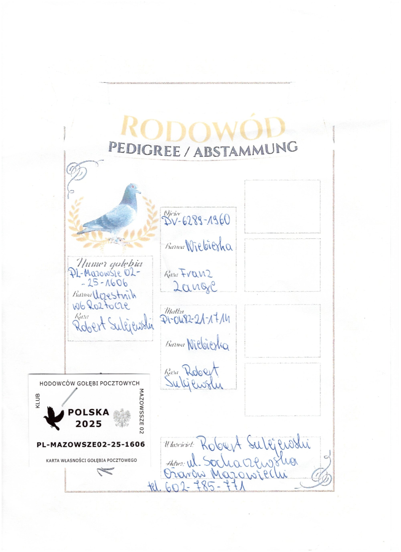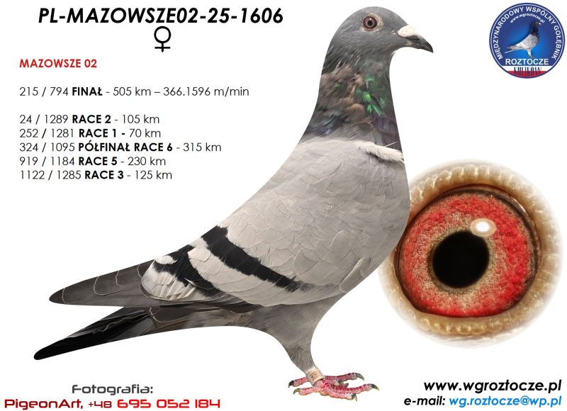 Opis: Gołąbek po całym bardzo wymagającym programie na WG ROZTOCZE 2025 loty pod wiatr lub boczny. 6 Lotów Konkursowych 1350 kkm zdobywając 215 miejsce z Finału 505km więcej info.w rodowodzie i na stronie Benzing Live.oneloftrace.live/lofts/260?season=2458&tab=flights zapraszamy na sezon 2026.