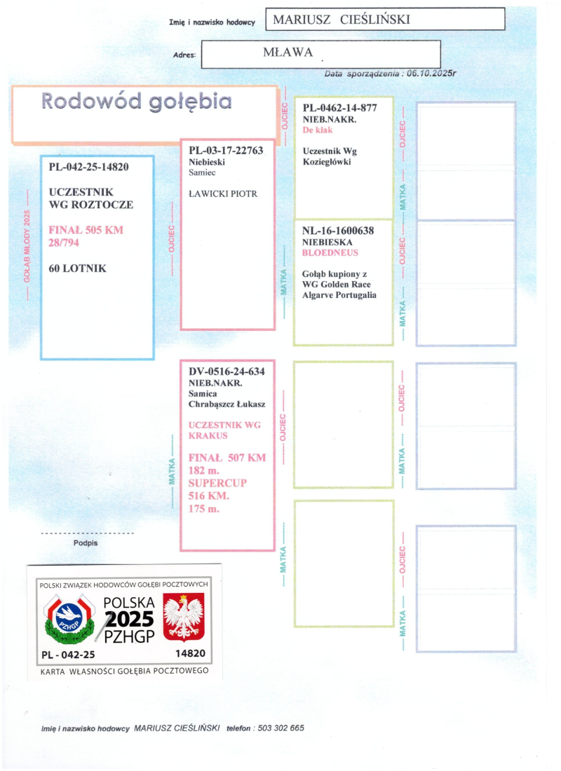 Płeć: samiec Hodowca - rasa: Oryg.CIEŚLIŃSKI MARIUSZ Zakończenie: 22.10.2025 godz. 20:21