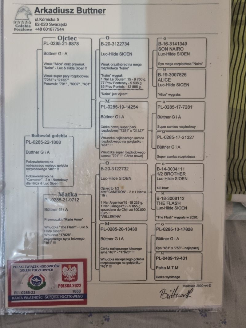 Sprzedam oryginalnego gołębia Arkadiusz Buttner super samica rozpłodowa więcej info w rodowodzie cała hodowla na sprzedaż zapraszam