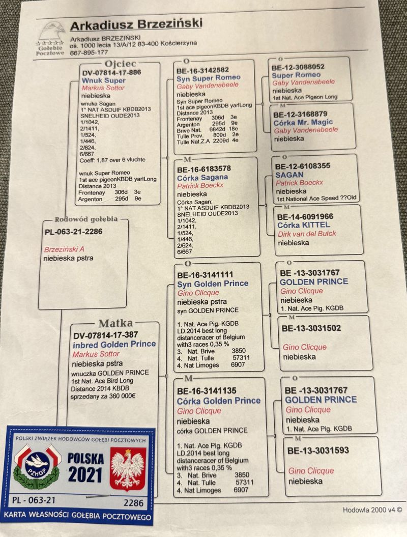 Oryginalny gołąb z hodowli Arkadiusza Brzezińskiego. Szczegóły pochodzenia w rodowodzie. Więcej informacji pod nr tel.: 504 622 421 **możliwość wysyłki za pomocą firmy kurierskiej na koszt kupującego lub odbiór osobisty, bądź dowiezienie gołębi na wystawę do Katowic (w tym przypadku proszę o przedpłatę).