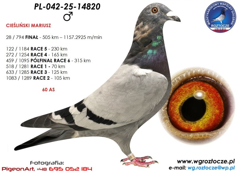 Jest to jedyny dostępny pełny brat finalisty w Pattaya który zajął 59/5854 a z polskich gołębi był 2. Pełna siostra poszła jeszcze na Extra Finał 600km i zajeła 199/3757 i była 12 z Polskich gołębi. W sezonie 24/25 nastepny brat zajął 241/6101. Samiczek nie ma dostępnych. Rodzice tych gołębi były lotowane w oddziale, samczyk został 7 lotnikiem w Kłobucku. Możliwe DNE. Wiecej informacji na tel.