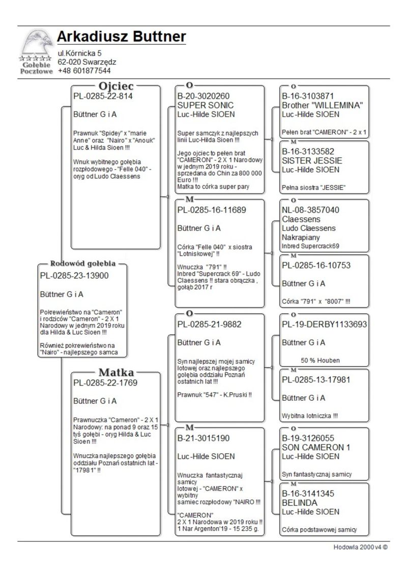 Fajny samczyk, prawnuk 17981 - najlepszej mojej samicy lotowej w historii hodowli oraz Pokrewieństwo na "Cameron" i rodziców "Cameron" - 2 X 1 Narodowy w jednym 2019 roku dla Hilda & Luc Sioen !!!