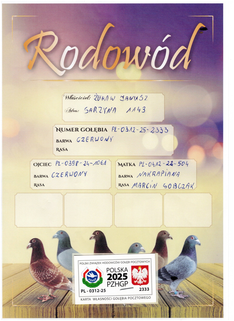 Płeć: samiec Hodowca - rasa: Oryg.ŻURAW JANUSZ Zakończenie: 23.10.2025 godz. 20:27