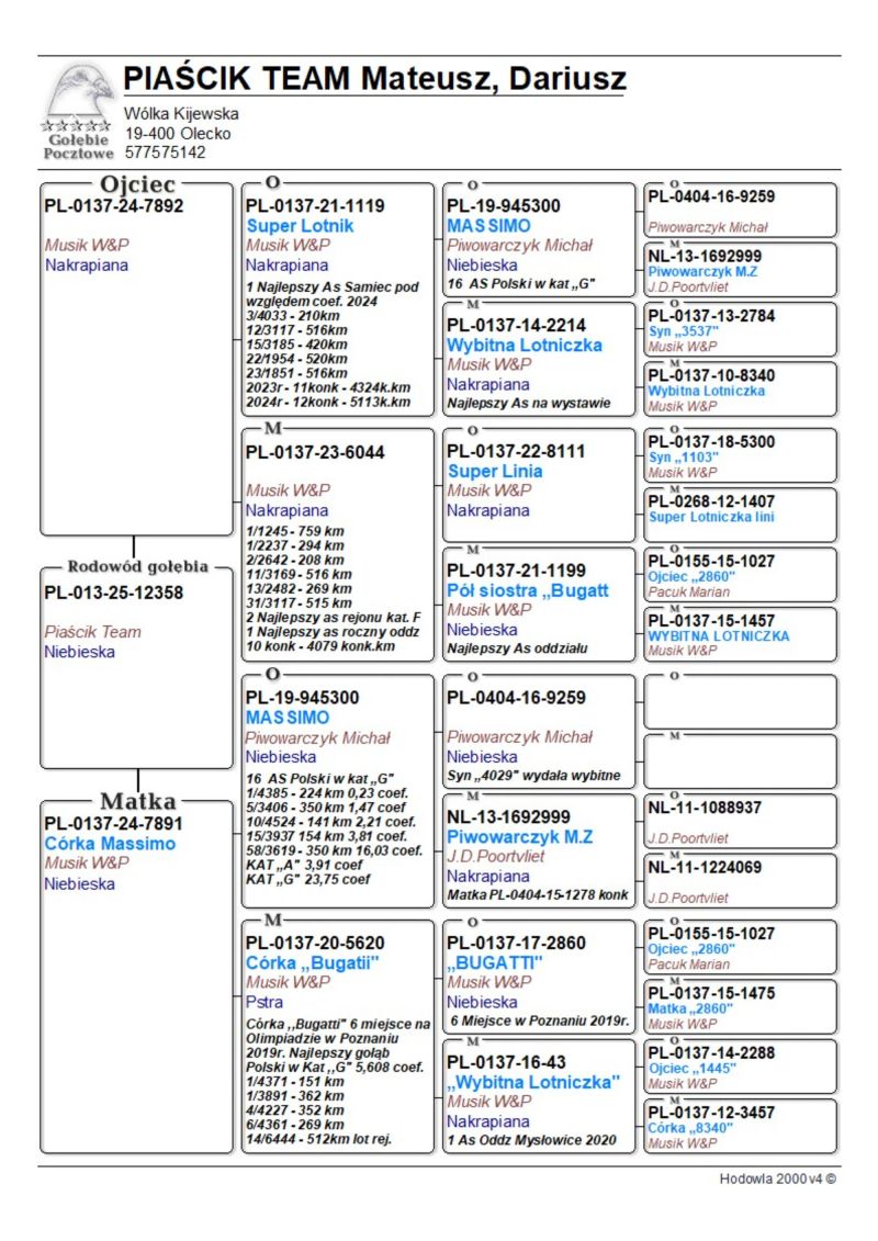 WNUK/WNUCZKA KAPITALNEGO LOTNIKA "1119" - NAJLEPSZY AS SAMIEC ODDZIAŁU MYSŁOWICE POD WZGLĘDEM COEFF. 2024R / W SEZONIE 2024 ZDOBYŁ 12KONK. / W SEZONIE 2023 ZDOBYŁ 11KONK. | WNUK/WNUCZKA WSPANIAŁEJ ROCZNEJ LOTNICZKI "6044" - 2AS REJONU KAT. F 2024R / 1 NAJLEPSZY AS ROCZNY ODDZIAŁU 2024R - 10KONK. - M.IN.: 1/1245SZT - 759KM. / 1/2237SZT - 294KM. / 2/2642SZT - 208KM. | WNUK BAZOWEGO SAMCA ROZPŁODOWEGO HODOWLI "MASSIMO 300" - 16AS POLSKI KAT. SPORT G (OJCIEC I DZIADEK SUPER LOTNIKÓW) |Wiecej informacji o gołębiu pod nr tel.:577575142 Szczegóły pochodzenia gołębia w rodowodzie