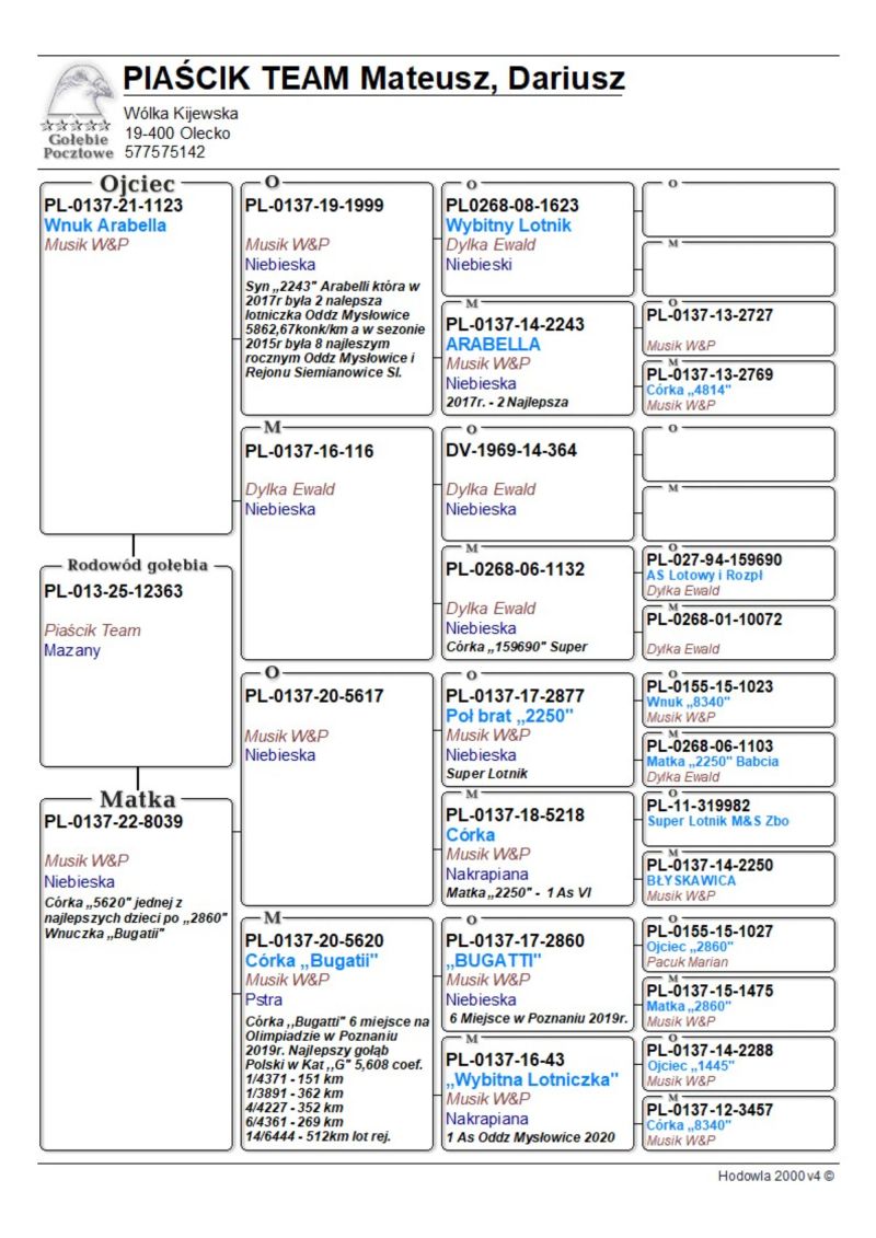 WNUCZKA SAMICY "5620" - JEST ONA CÓRKĄ OLIMPIJCZYKA "BUGATTI" - NAJLEPSZY GOŁĄB POLSKI / 6 MIEJSCE NA OLIMPIADZIE W POZNANIU - KAT. SPORT G. - 5,608COEFF. |Wiecej informacji o gołębiu pod nr tel.:577575142 Szczegóły pochodzenia gołębia w rodowodzie